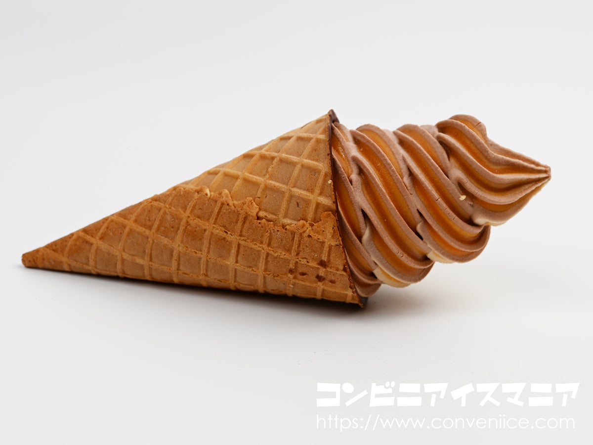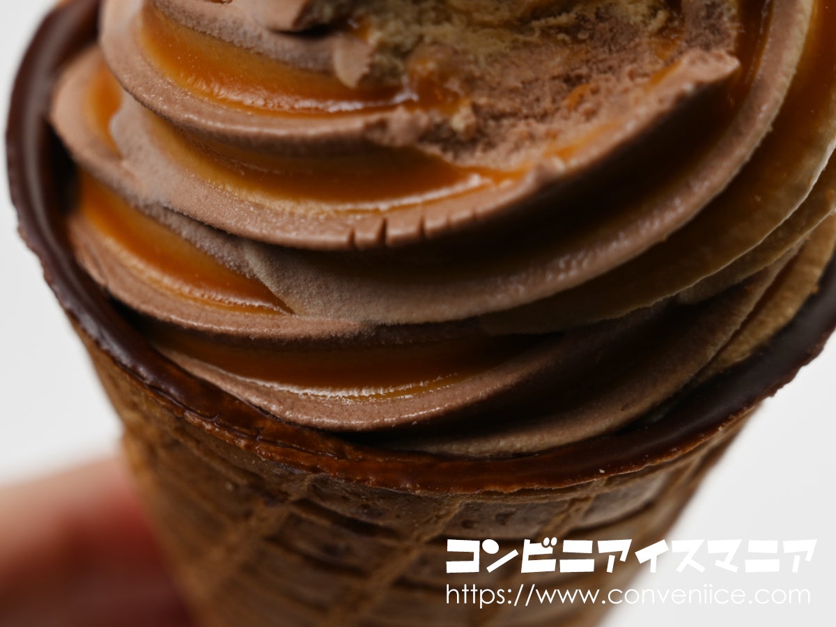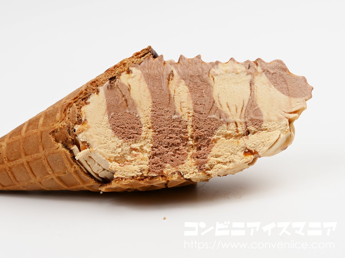 コーン底部まで食べ進めるとチョコレートコーティングとキャラメルが合流!最後のひと口まで飽きさせない設計に赤城乳業の本気を感じました。