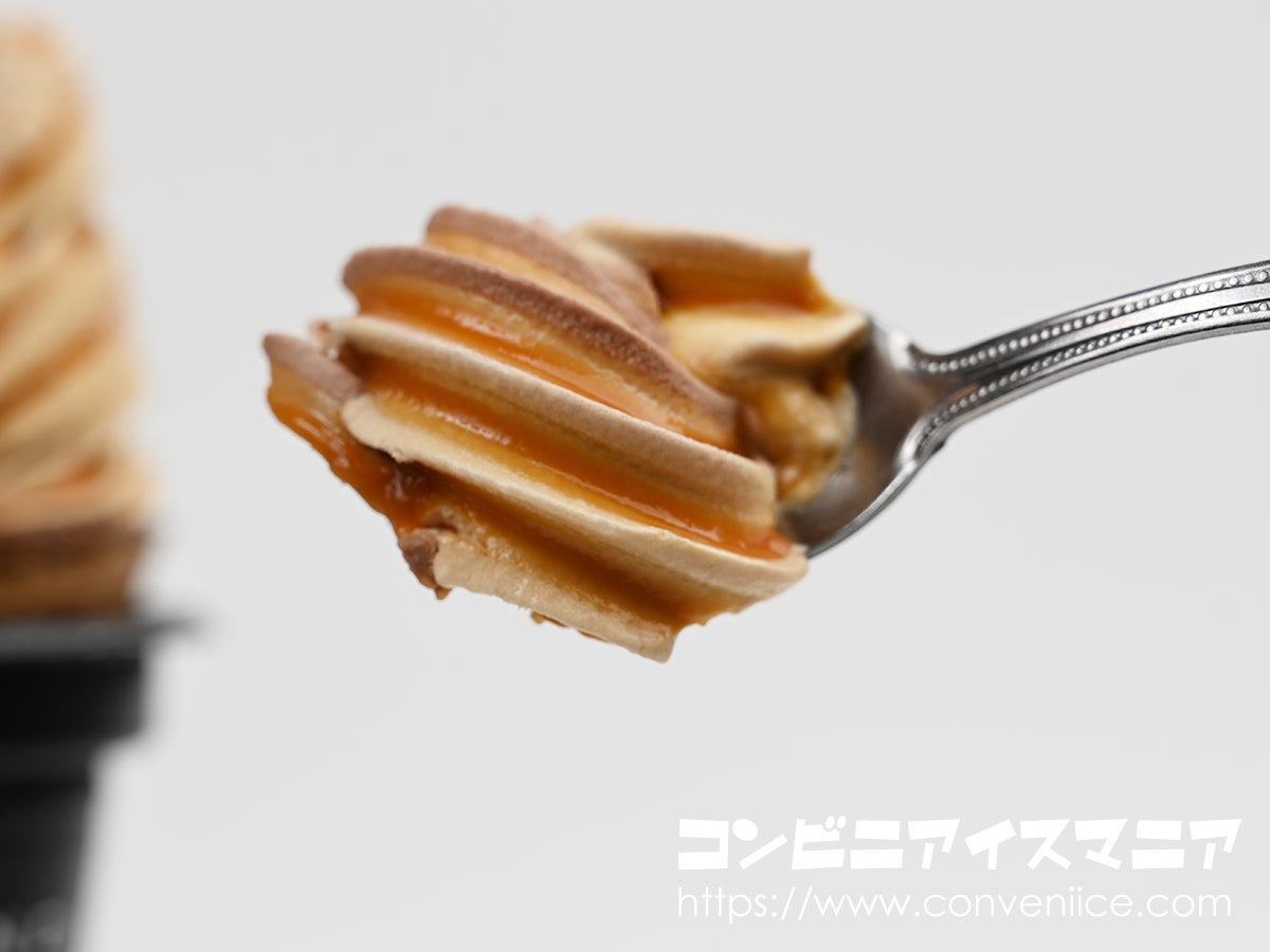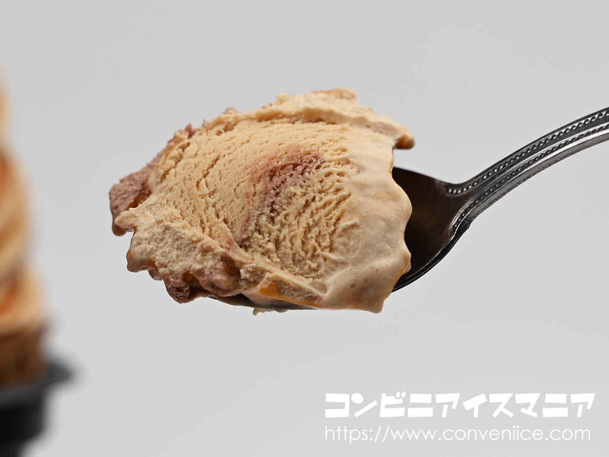 アイスの外側にはキャラメルソース。これは「CHOCOLATE BANK ワッフルコーン ビター&ホワイトチョコレート ~ストロベリーソースがけ~」がストロベリーソースを外巻きにしているのと同様の仕様で、赤城乳業のワッフルコーン製造技術の高さがうかがえます。