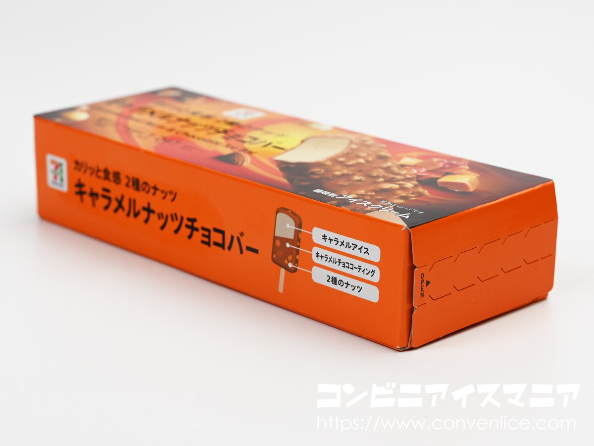 側面には3層構造を図解したイラストが描かれており、上から「キャラメルアイス」「キャラメルチョココーティング」「2種のナッツ」という構成が一目でわかる親切設計です。