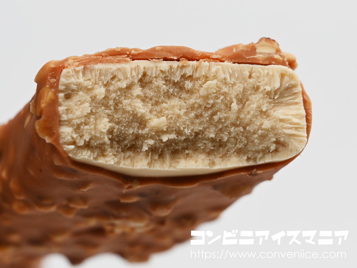 アイスバーをひと口かじると、まず「カリッ」とした小気味よい音が響きます。シュガーコートされたマカダミアナッツのカリカリ食感、そしてアーモンドクランチのザクザクとした歯ごたえ。2種類のナッツが織りなす食感のコントラストがたまりません!