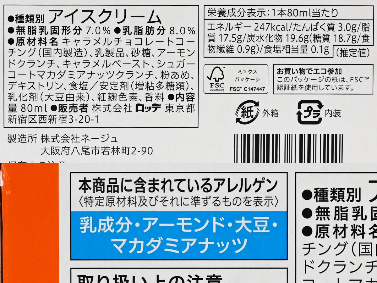 販売者は株式会社ロッテ。製造は株式会社ネージュが担当。同社は1949年創業、1959年からアイスクリームの製造を手掛ける老舗アイスメーカー。ロッテをはじめ、森永乳業、森永製菓など大手食品メーカーからOEM製造を受託しており、HACCP、ISO22000、FSSC22000といった食品安全認証も取得しています。