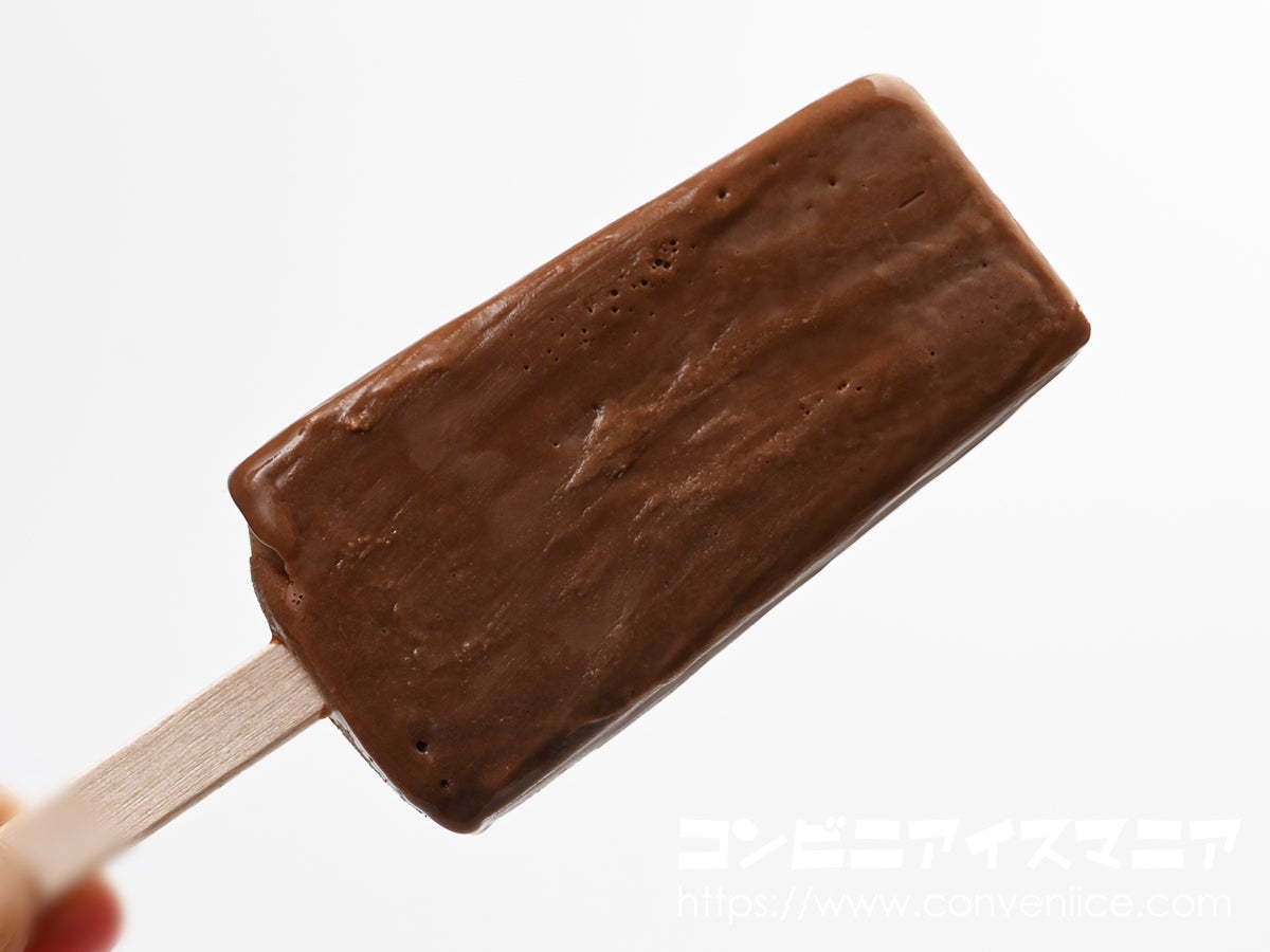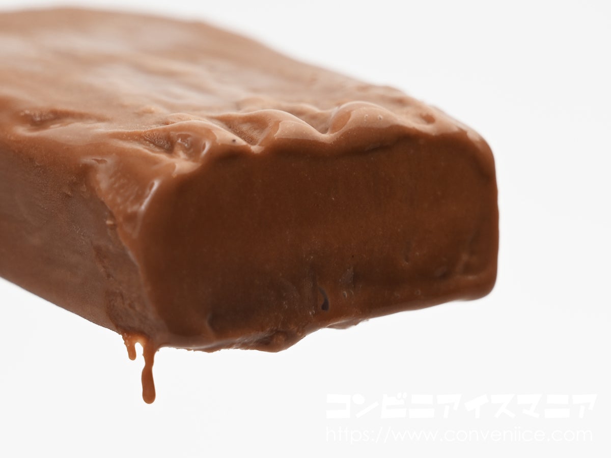 袋を開けた瞬間、ふわっと香るカカオの芳醇なアロマ。アイスバー本体は深みのあるチョコレートブラウン。冷凍庫から取り出して少し時間を置き、ちょい溶け状態にすると、なめらかでクリーミーな質感がよくわかります。