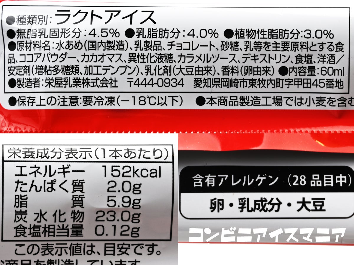 ひと口かじると、アイスらしからぬ「ねっちり」「もっちり」「とろける」独特の食感。これぞ「ほぼ生チョコアイスバーシリーズ」の真骨頂!原材料を見ると、水あめをベースに、乳製品、チョコレート、砂糖、ココアパウダー、カカオマスを配合。さらにカラメルソースで深みを加え、洋酒(アルコール分0.1%未満)で風味を引き立てています。この絶妙な配合が、冷凍下でもやわらかく、生チョコのような食感を実現しているのです。