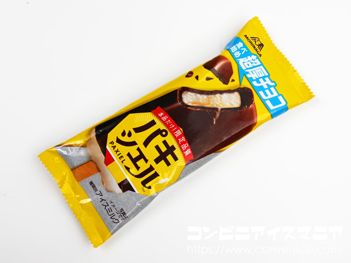 右上には森永製菓のロゴマーク「エンゼルマーク」が配され、「超厚チョコ」の力強いゴシックフォントがひときわ目を引きます。パッケージ中央には、分厚いチョコレートコーティングの断面がリアルに描かれており、「本品だけ!限定品」という赤いバナーが限定感を演出。パキシエルのブランドロゴの下にはベルギーチョコ仕様を伝えるベルギー国旗カラーを採用しています。