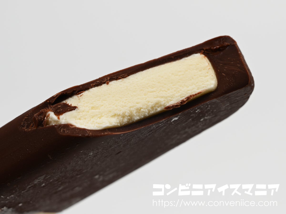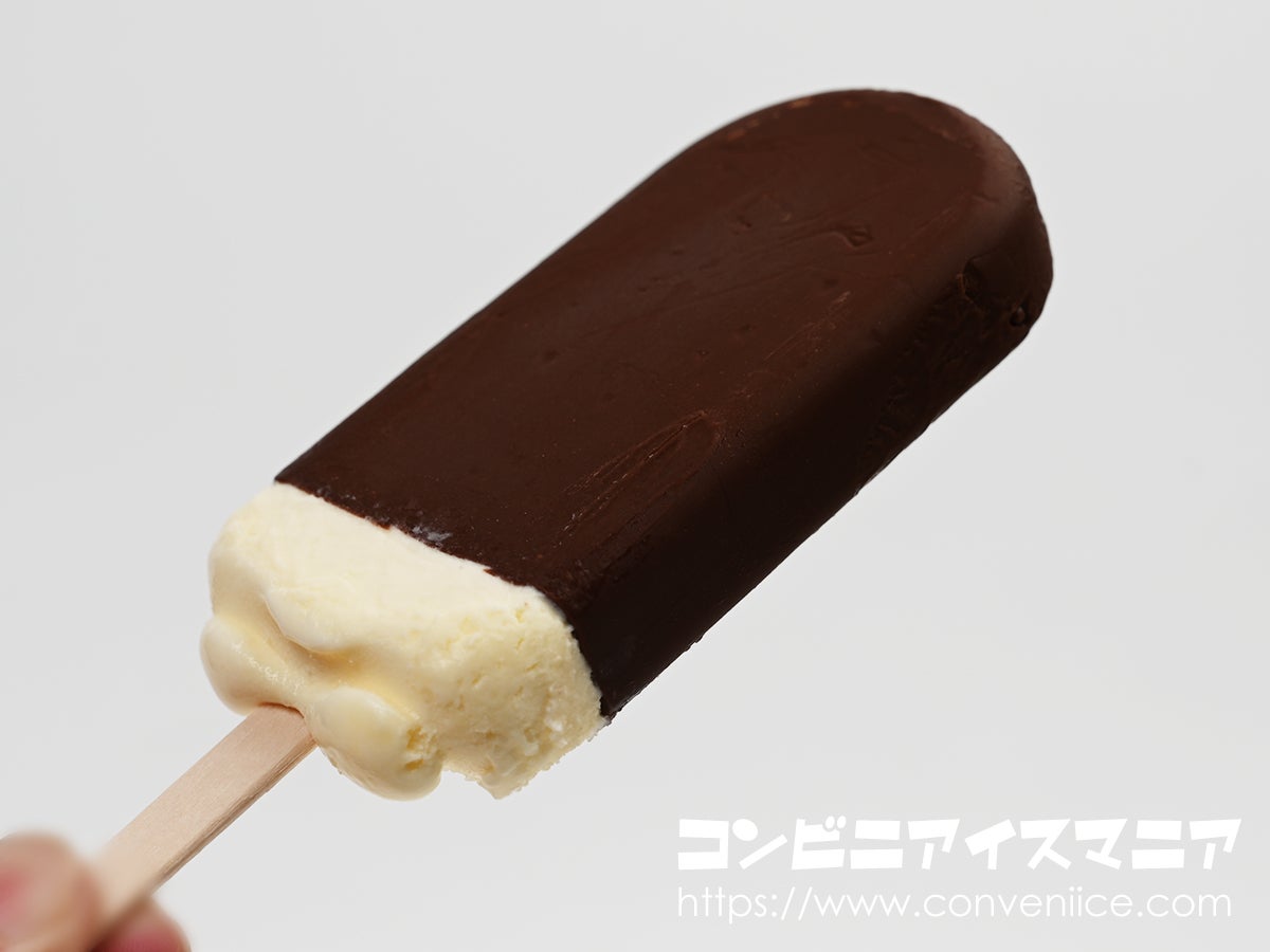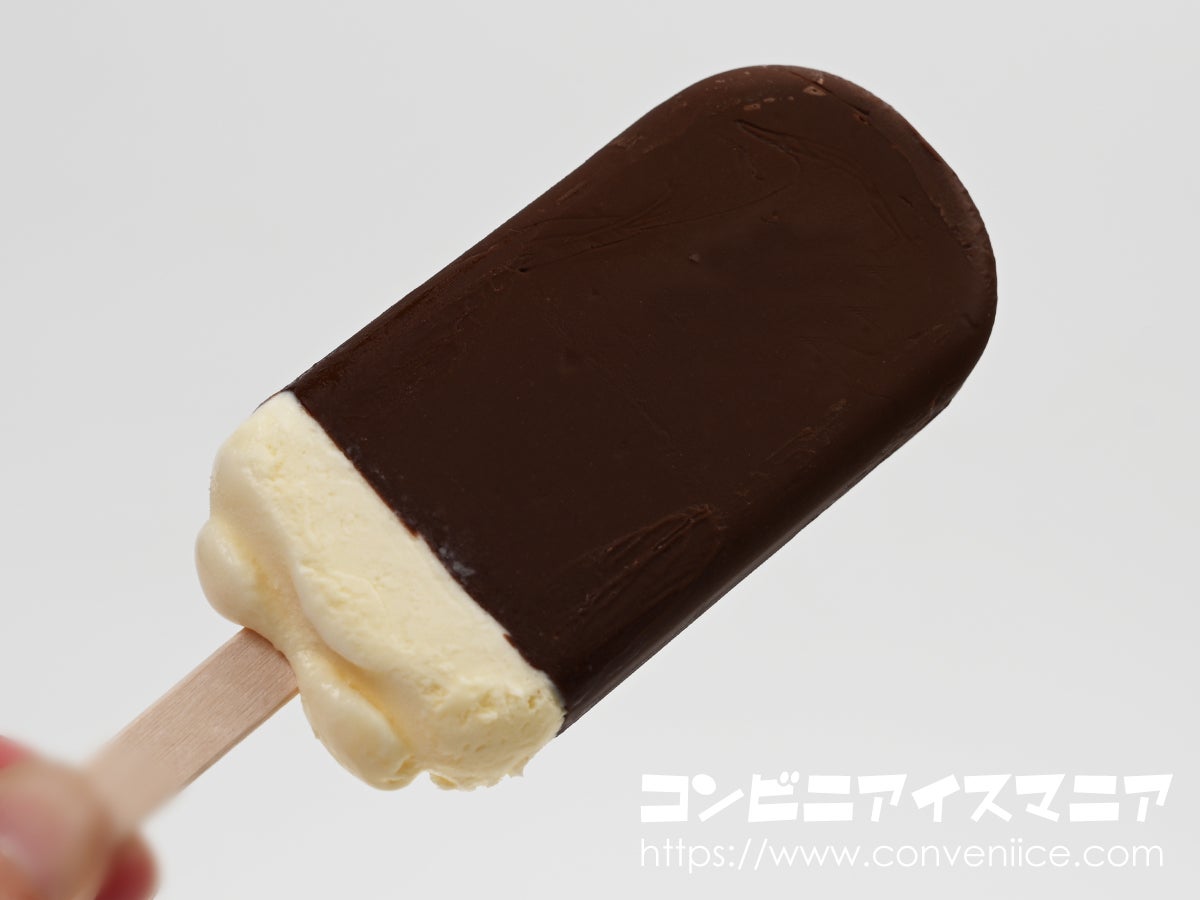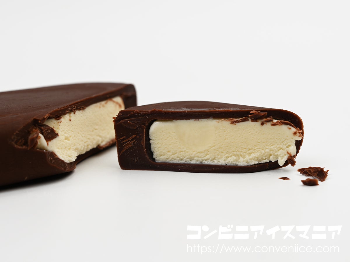 内側のバニラアイスは、アイスミルク規格ならではのコクがありながら、後味はすっきり。チョコの濃厚さを引き立てる、まさに「引き立て役」に徹した味わい。チョコとアイスを一緒にほおばると、冷たい板チョコを食べているような独特の満足感が広がります。