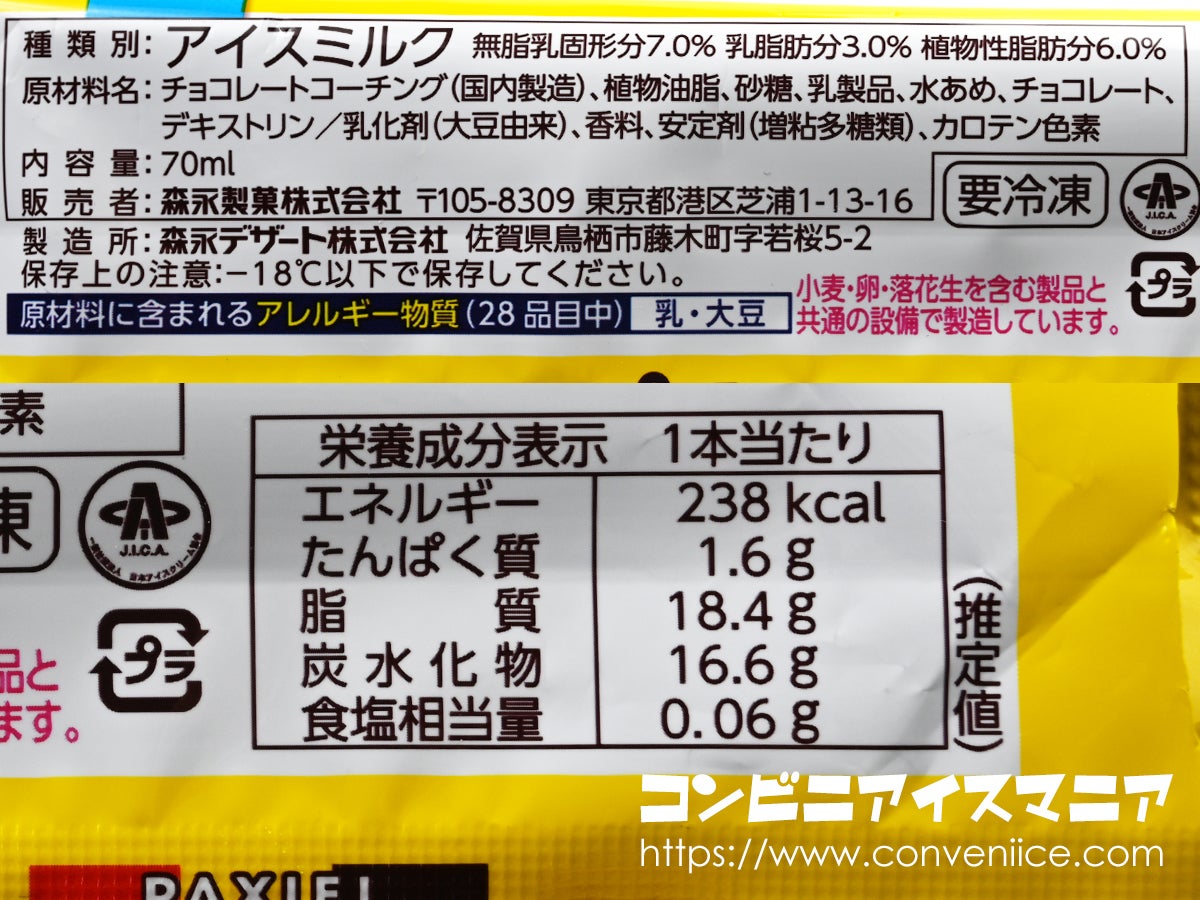 パキシエルもまた、その系譜に連なる一品。「チョコの比率42%」という高いチョコ含有率、(同社「板チョコアイス」の約45%に迫る数値)「先端7mmの分厚いチョコ」という設計、食べた時のパキっとした心地よい食感。森永ならではの技術力が凝縮されています。