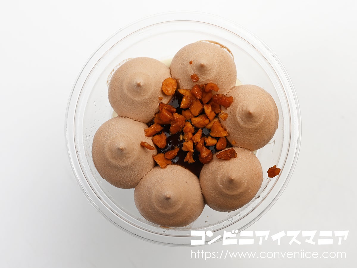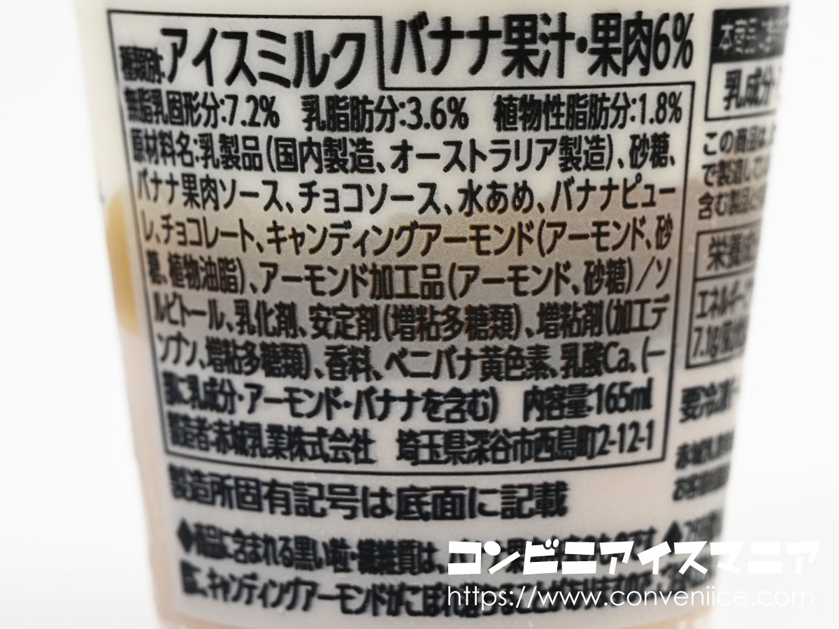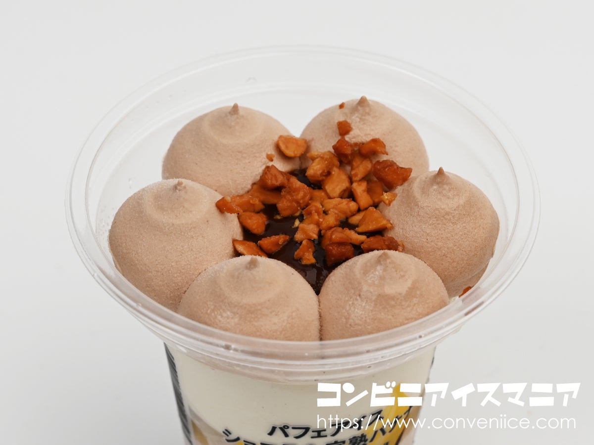 内容量は165ml。セブン-イレブンで展開されている巨峰バニラパフェなどと同サイズで、手頃でありながらもしっかりとした満足感が得られるボリューム。透明カップを採用しているため、側面からショコラアイスとバナナアイスの美しい層が確認でき、まるでパティスリーのパフェのような贅沢感が伝わってきます。
