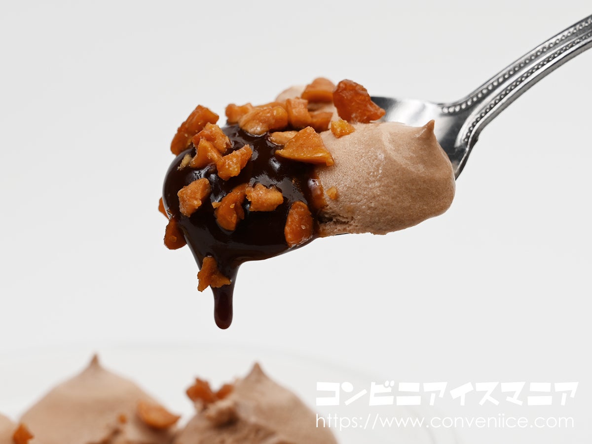 中央にはキャンディングアーモンドがトッピングされ、その下からはとろりとしたチョコソースが顔を覗かせています。冷凍状態でもツヤ感のあるチョコレートアイスの表面が印象的で、見た目からすでに高級感が漂います。