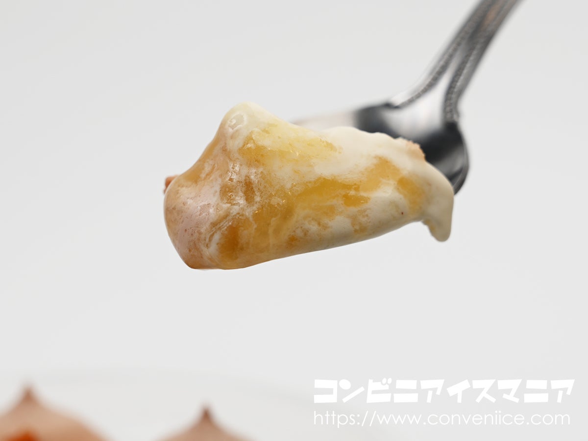 さらに、各アイス部分には隠し味としてアーモンド原料が配合されており、全体の味わいの親和性を高めています。ショコラとバナナの間に潜むバナナ果肉ソースもポイント。とろりとした果肉感のあるソースが、味わいに変化をもたらしてくれます。冷凍状態でもやわらかさを保つソースの質感が印象的でした。