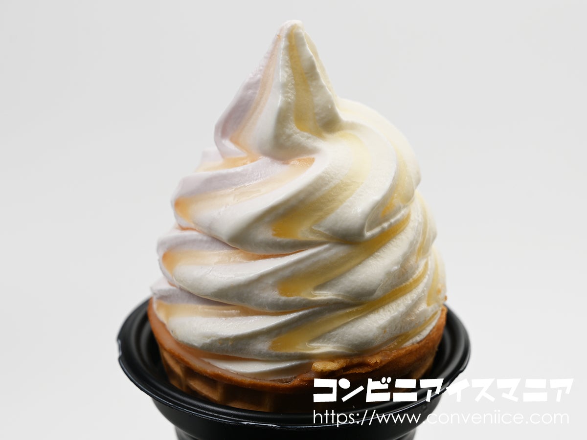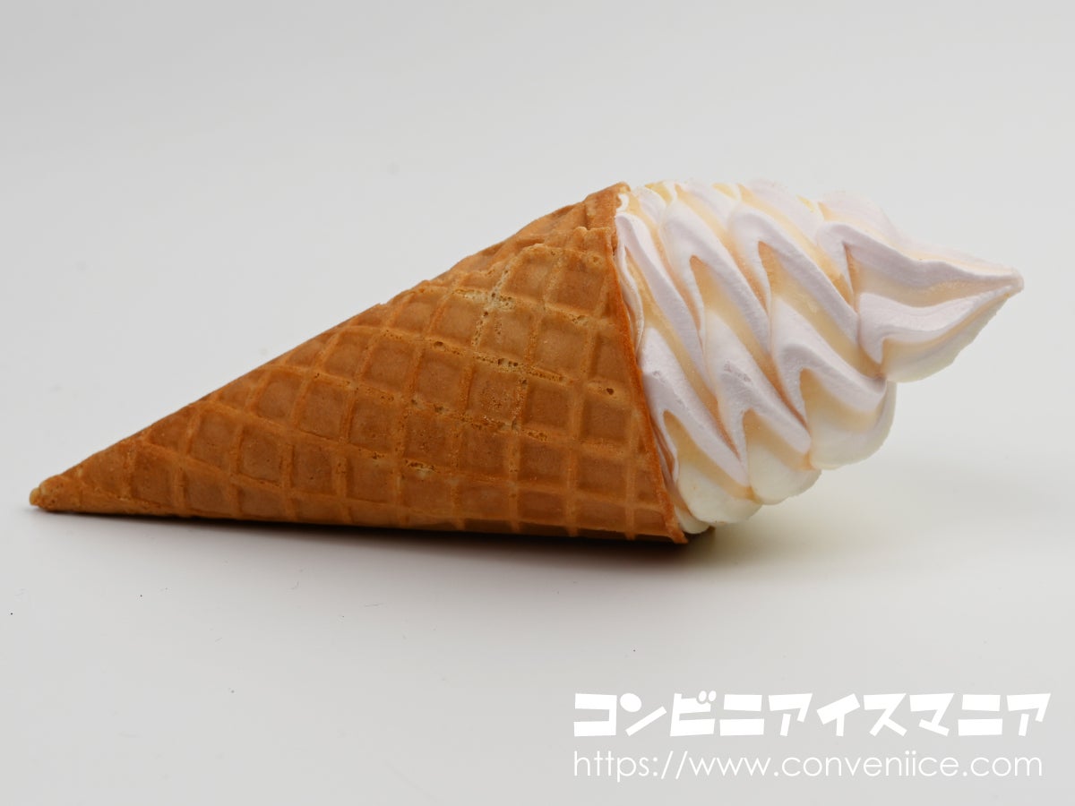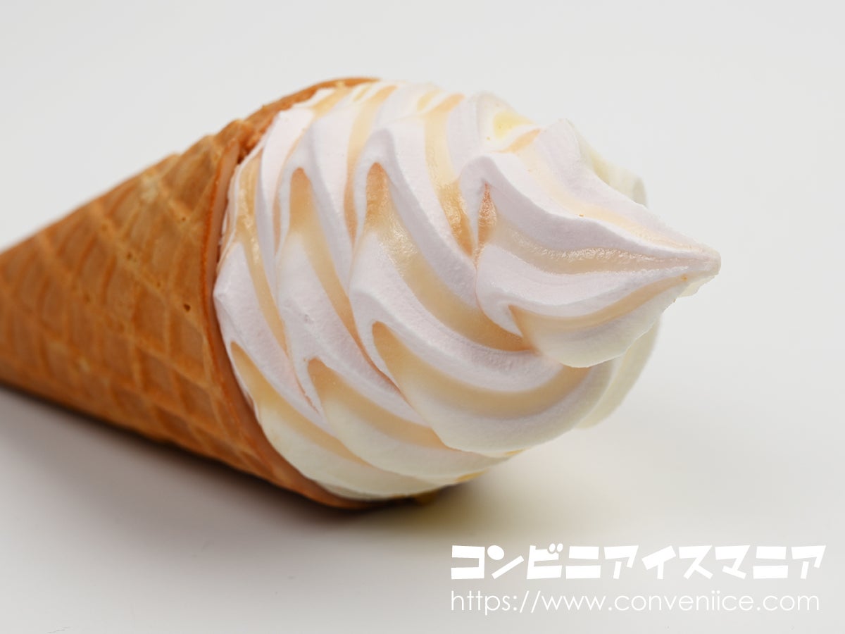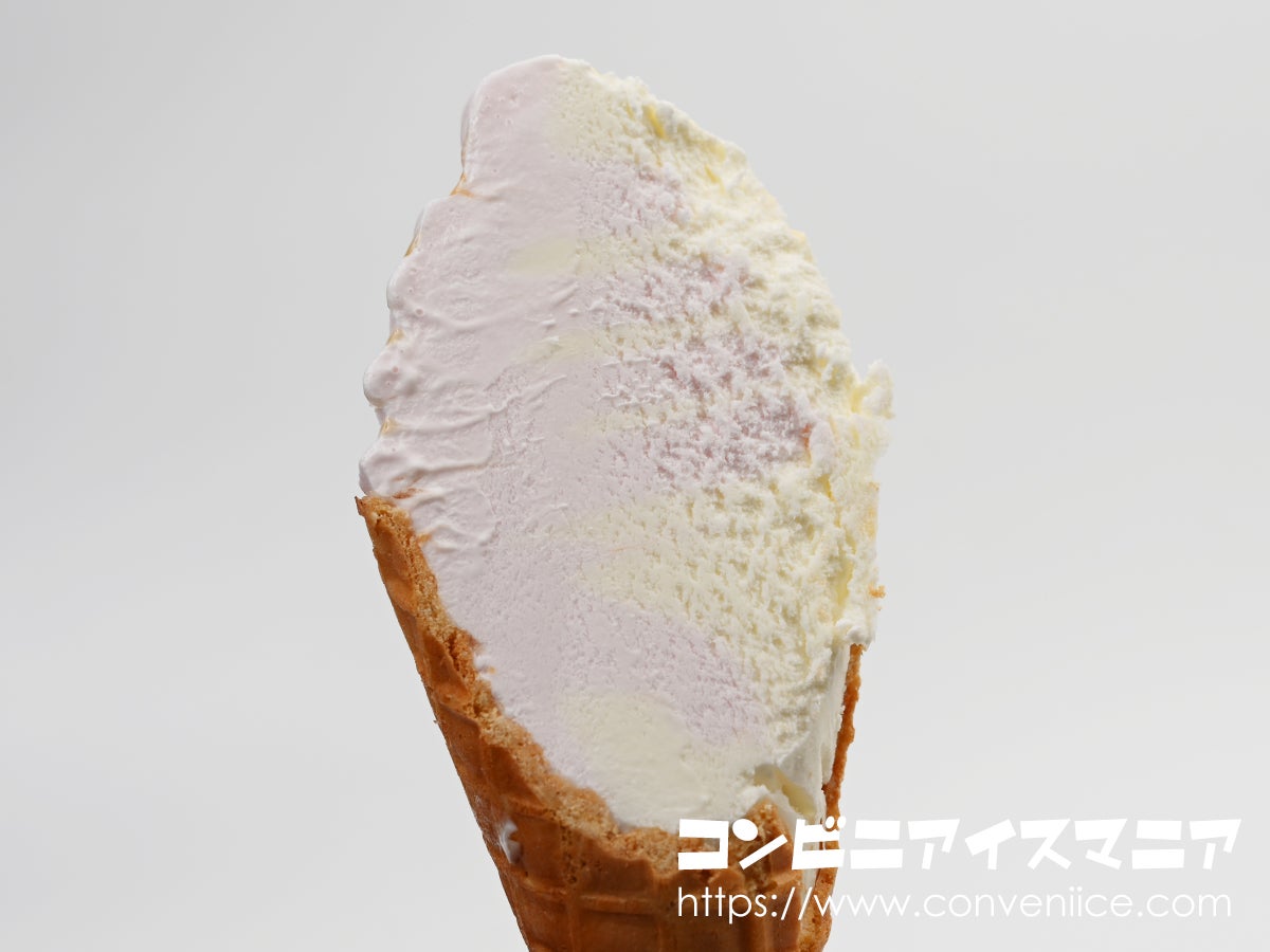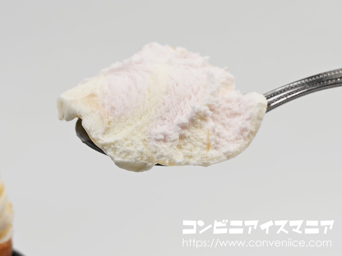 透明な蓋越しに、ソフトクリーム状に巻き上げられた白いアイスが確認できるのもポイント。白とほんのりイエロー、淡いピンクのマーブル模様が美しく、店頭での視覚的なインパクトは抜群。手に取った瞬間から「これは普通のコンビニアイスではないな」と感じさせる存在感があります。