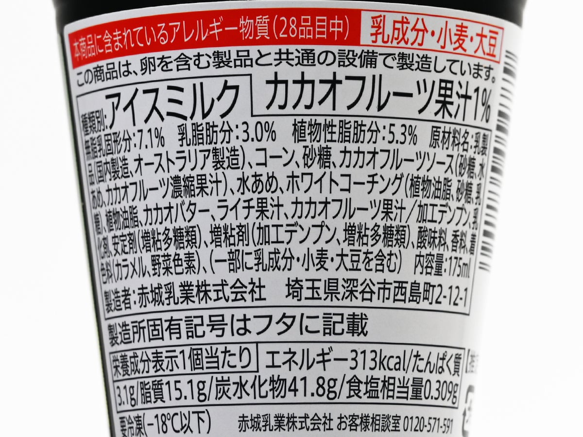 さらに、カカオフルーツアイスに「隠し味」として配合されたライチ果汁の存在感。原材料表示にしっかり記載されていますが、ライチの華やかな味わいがカカオフルーツの持ち味を底上げし、フルーティーな印象をいっそう際立たせています。カカオフルーツソースはアイスの溝に沿って巻かれており、甘酸っぱいアクセントに。