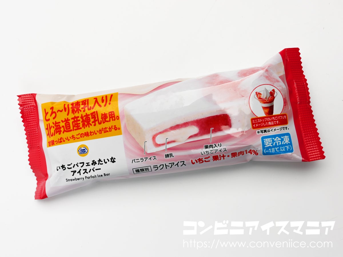 パッケージは白を基調に、いちごの赤をアクセントカラーに配したデザイン。左上には「とろ~り練乳入り!北海道産練乳使用。甘酸っぱいいちごの味わいが広がる。」というキャッチコピーがオレンジ色の帯で目を引きます。中央にはアイスバーの断面イメージが配され、「バニラアイス」「練乳」「果肉入りいちごアイス」の3層構造がひと目で分かる親切な設計。右上にはミニストップの店頭パフェ「いちごパフェ」のビジュアルが添えられています。種類別はラクトアイス。いちごの果汁・果肉14%使用というスペックもしっかり記載されており、果実感への期待が高まります。