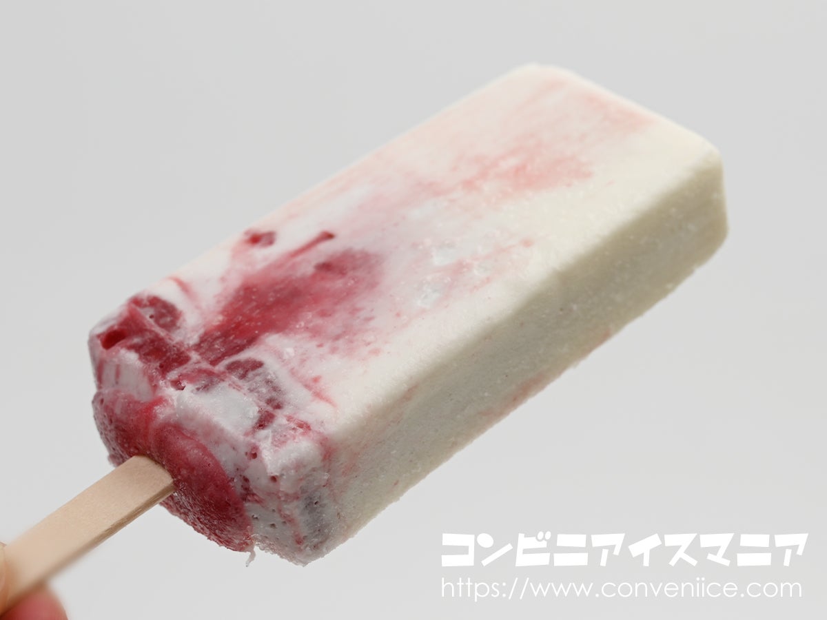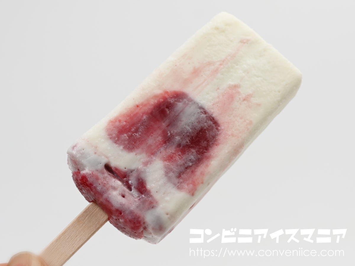 袋から取り出すと、白いバニラアイスの表面にいちごアイスの赤がマーブル状に入り混じった、華やかなビジュアルが目に飛び込んできます。いちごの果肉やソースが表面に透けて見え、まさにいちごパフェの断面をそのまま棒アイスにしたような見た目。