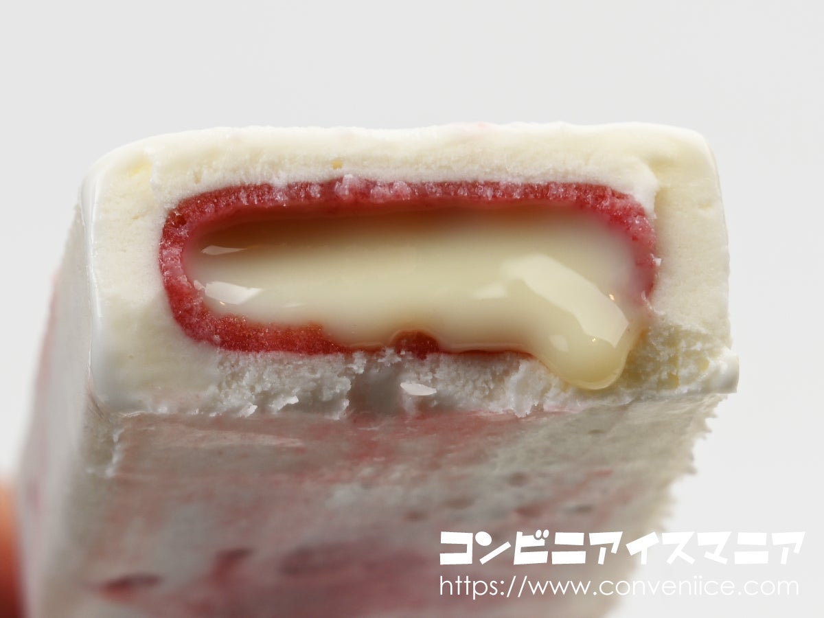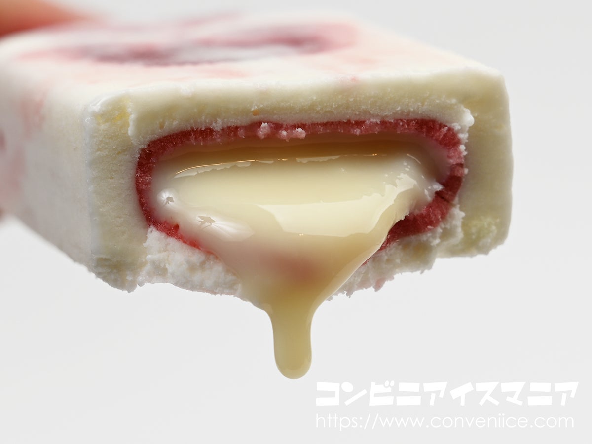 断面を見ると構造がよく分かります。外側のバニラアイス、その内側を囲むように配されたいちごアイスの層、そして中心部にはとろ~りとした練乳がたっぷり。この練乳が非常に印象的で少し溶かしてからカットすると中からとろりと流れ出てくるほどのたっぷり具合。北海道産練乳を使用しているというだけあって、この贅沢な練乳の存在感が本商品最大の見どころ。