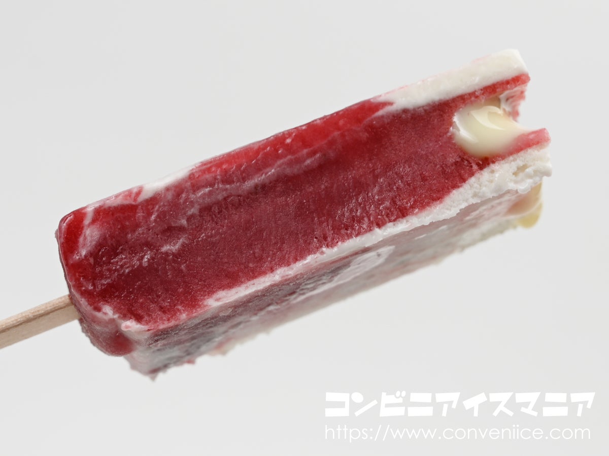 アイスバーを縦に切ってみると、いちごアイスの層がガッツリと下まで入っていることが確認できます。