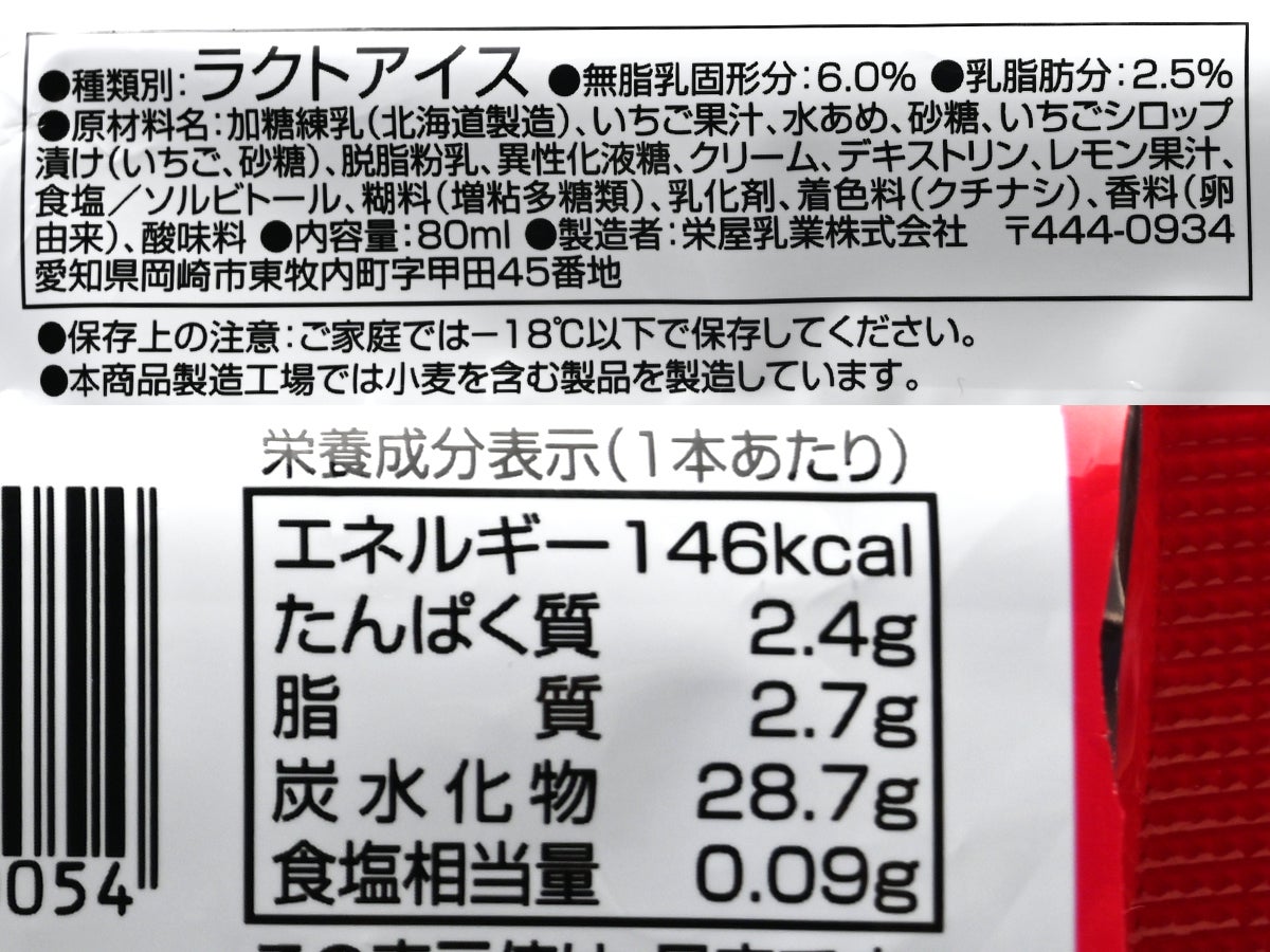 価格・内容量は据え置き。カロリーは今回のいちごパフェの方が35kcalほど低く、脂質も2.7gと控えめ。種類別がアイスミルクからラクトアイスになっている点は、乳脂肪分2.5%という数値からも分かるように、フルーツ系の味わいを際立たせるために乳成分をあえて抑えた設計と考えられます。いちごの風味をしっかり引き立てつつ、練乳でコクを補うという巧みなバランス設計。
