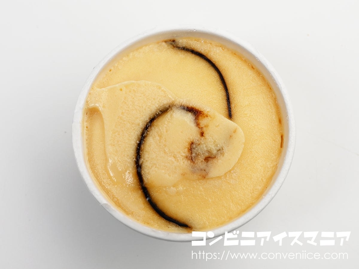 内蓋をはがすと、コーヒーの香りがふわり。淡いクリーム色の豆乳バニラアイスの上に濃いブラウンのエスプレッソソースがS字を描くように渦巻いています。このコントラストが実に美しい!パッケージ写真さながらの光景です。