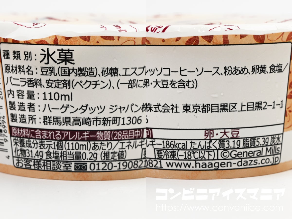 栄養成分は1個(110ml)あたり、エネルギー186kcal。通常のハーゲンダッツ ミニカップ「バニラ」が244kcalであることを考えると、約24%もカロリー控えめ。同じGREEN CRAFTの『豆乳バニラ』(170kcal)よりはやや高めですが、エスプレッソソースが加わっている分のリッチさを考えれば納得の数値です。
