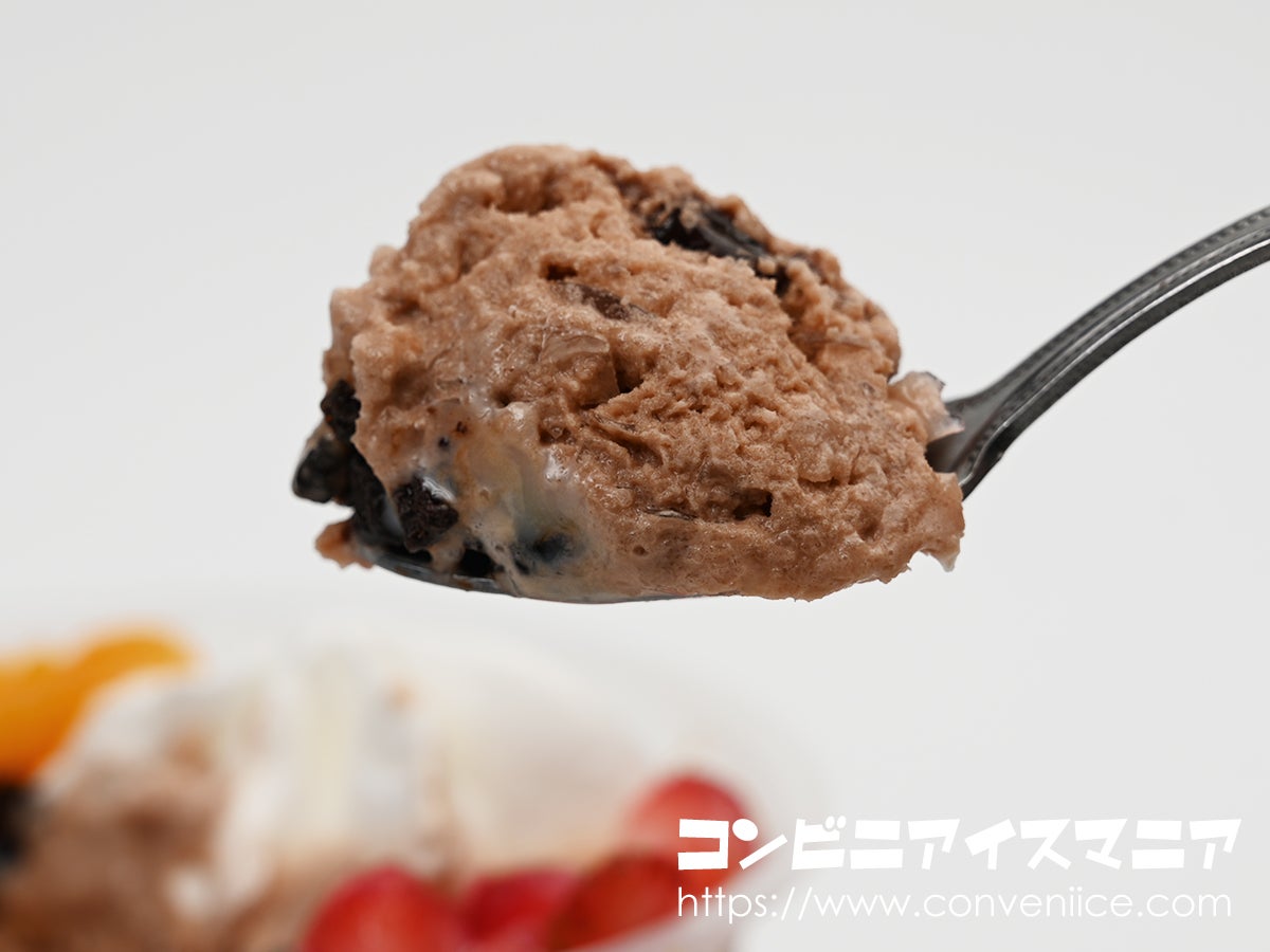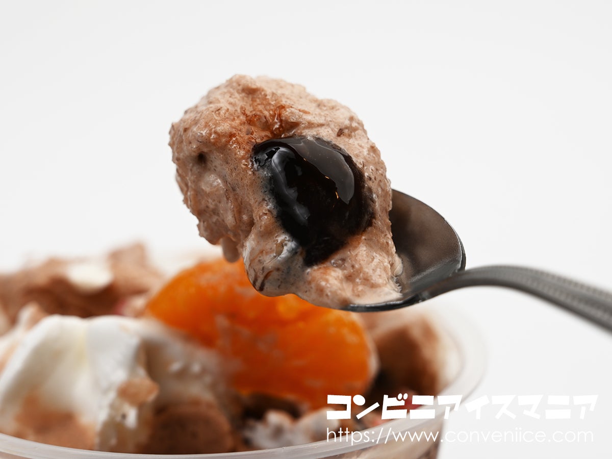 そしてスプーンを底のほうへ進めていくと、とろりと現れるのがチョコソース。この黒々としたソースがチョコ氷に絡みつくことで、カカオの風味がぐっと深まります。なお、このチョコソースには洋酒が使われており(アルコール分0.1%未満)、ほんのりと大人っぽいニュアンスが加わっているのもポイントです。