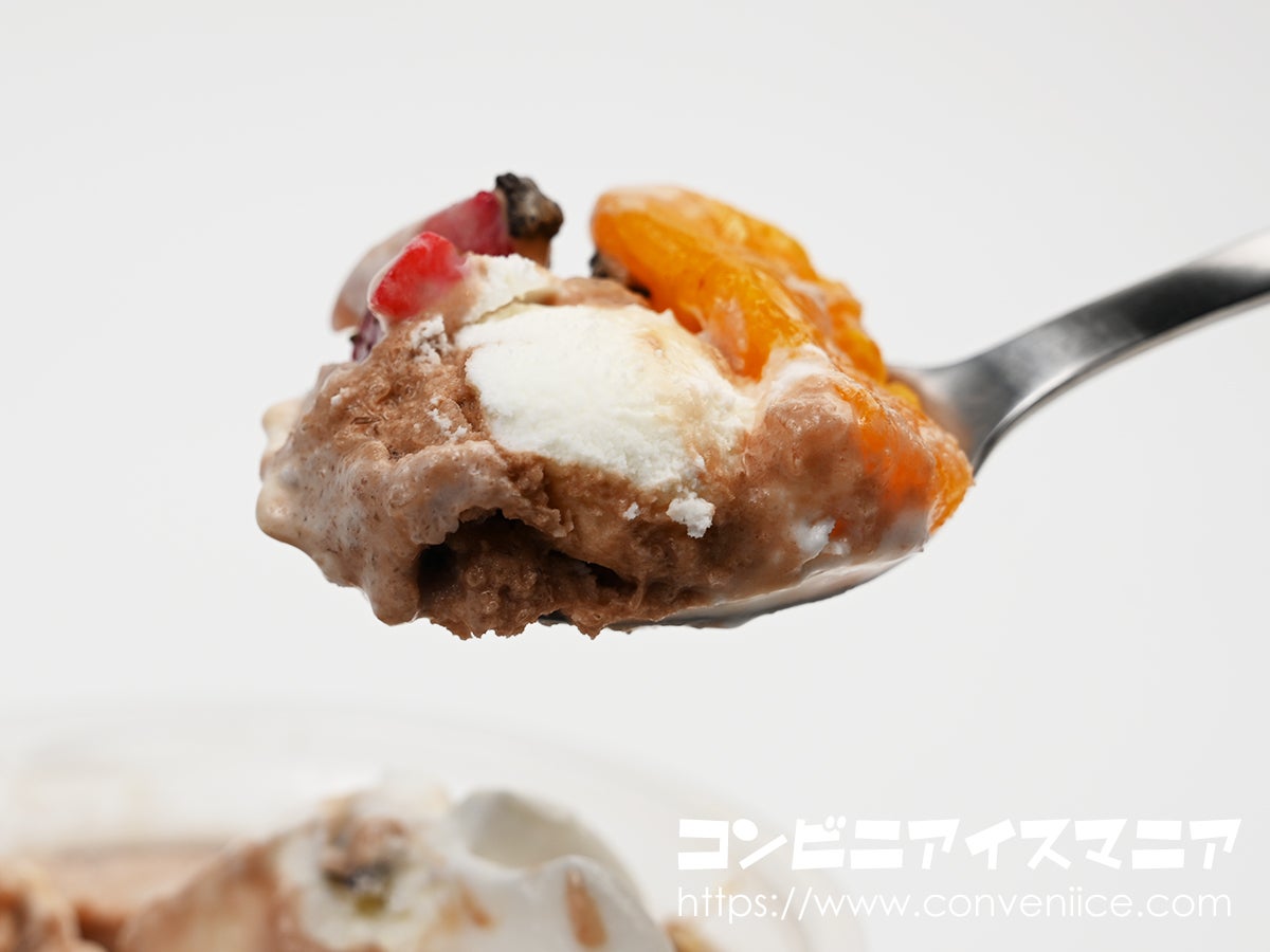 少し時間を置いて、やわらかくなってから食べるのがおすすめ。チョコ氷が溶けはじめると、フルーツやバニラフロートと自然に混ざり合い、各素材が一体となったまろやかな味わいに変化します。しろくまシリーズ全般に言えることですが、ほどよい解凍がおいしさを引き出す「鍵」になりますので、ぜひお試しを。