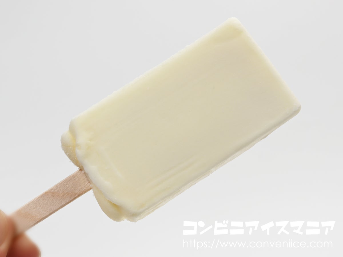 パッケージを開封すると、美しい乳白色のアイスバーが登場。表面はなめらかでミルキーな白色が目を引きます。ヨーグルトアイスらしい清潔感のある上品な見た目。