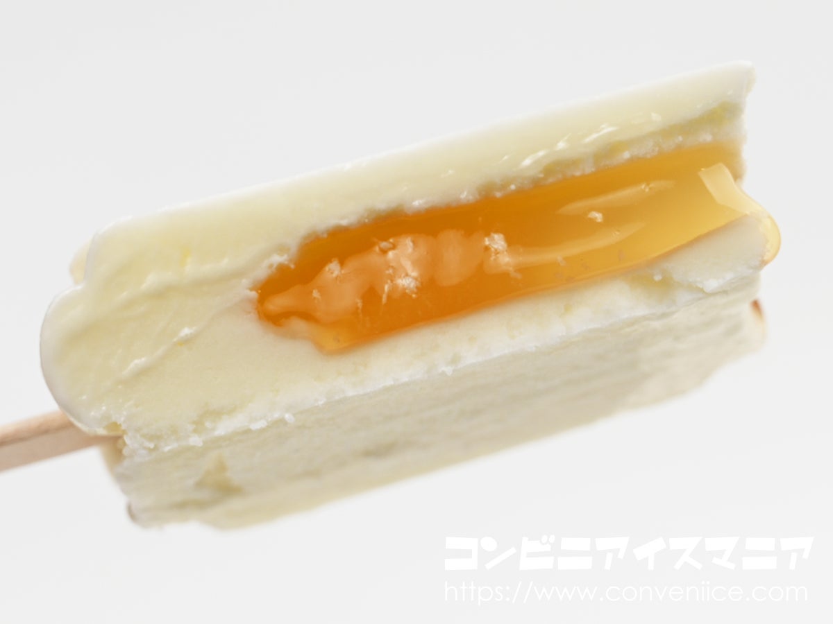 断面を見てみると――ここが最大の見どころ。白いヨーグルト味アイスの中に、琥珀色に輝くはちみつソースが縦に2本のラインで充填されています。このソースがとにかくたっぷり!断面からとろ~りとはちみつソースが垂れ落ちてくるほどの充填量で、「たぷたぷ」の名に偽りなし。
