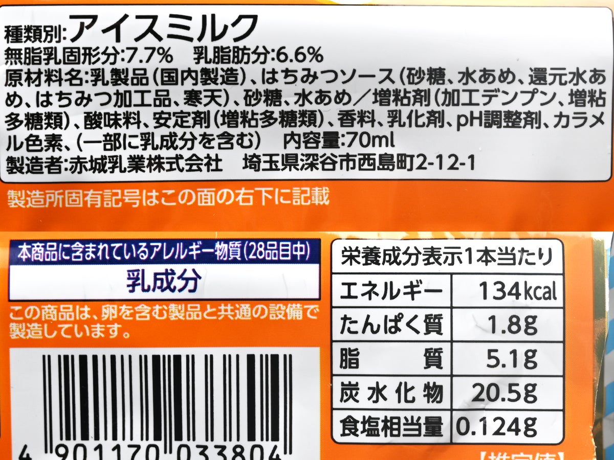 内容量は70ml。赤城乳業の素材系アイスバーとしてはおなじみのサイズ感です。参考までに、同社の「かじるバターアイス」が75ml、「至福のカスタード」も75ml、「カステラ風アイスバー」が80mlですから、若干コンパクトではありますが、手に持った感じは十分な厚みがあり食べごたえは申し分ありません。