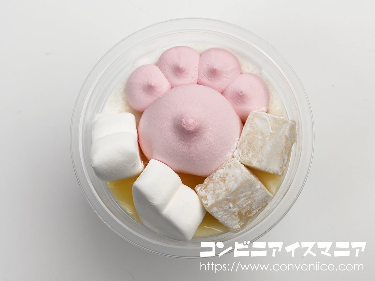 蓋を開けると、中央にどーんと鎮座しているのがピンク色の肉球型アイス。大きな肉球パッドと4つの小さな指パッドが愛らしく並び、その周りにはハート型の白いマシュマロと、ホワイトチョコ風わらび餅が配置されています。これはもう”映え”以外の何物でもありません。