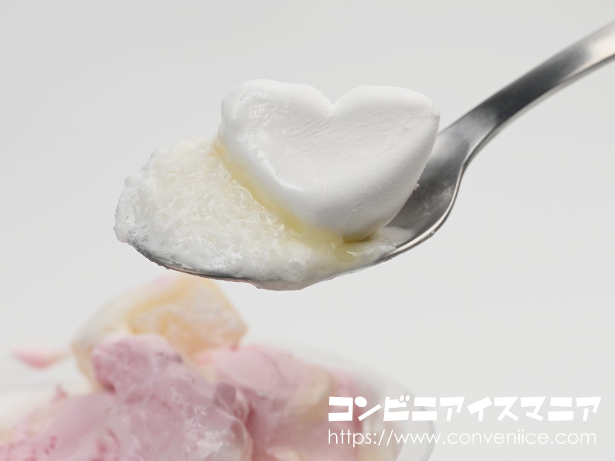 ハート型マシュマロは2025年版から引き続き登場。ふわふわとやわらかく、噛むとほどけるように消えていく甘さが健在です。とろとろの練乳と一緒にすくって食べると、もう幸せそのもの!
