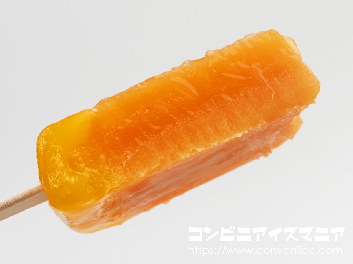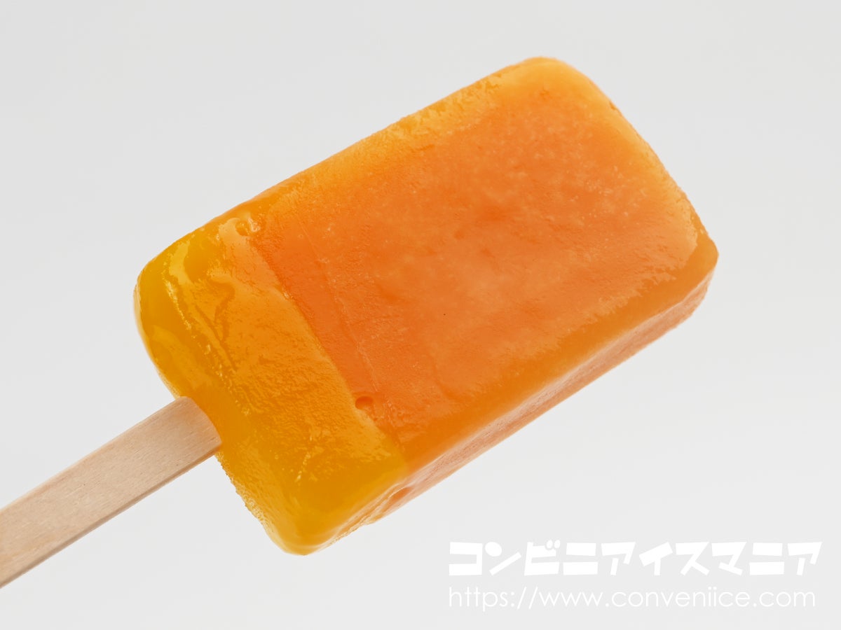 袋から取り出すと、鮮やかなオレンジ色のアイスバーが登場。表面はつやっとした光沢感があり、みかんをそのまま凍らせたようなビジュアルです。