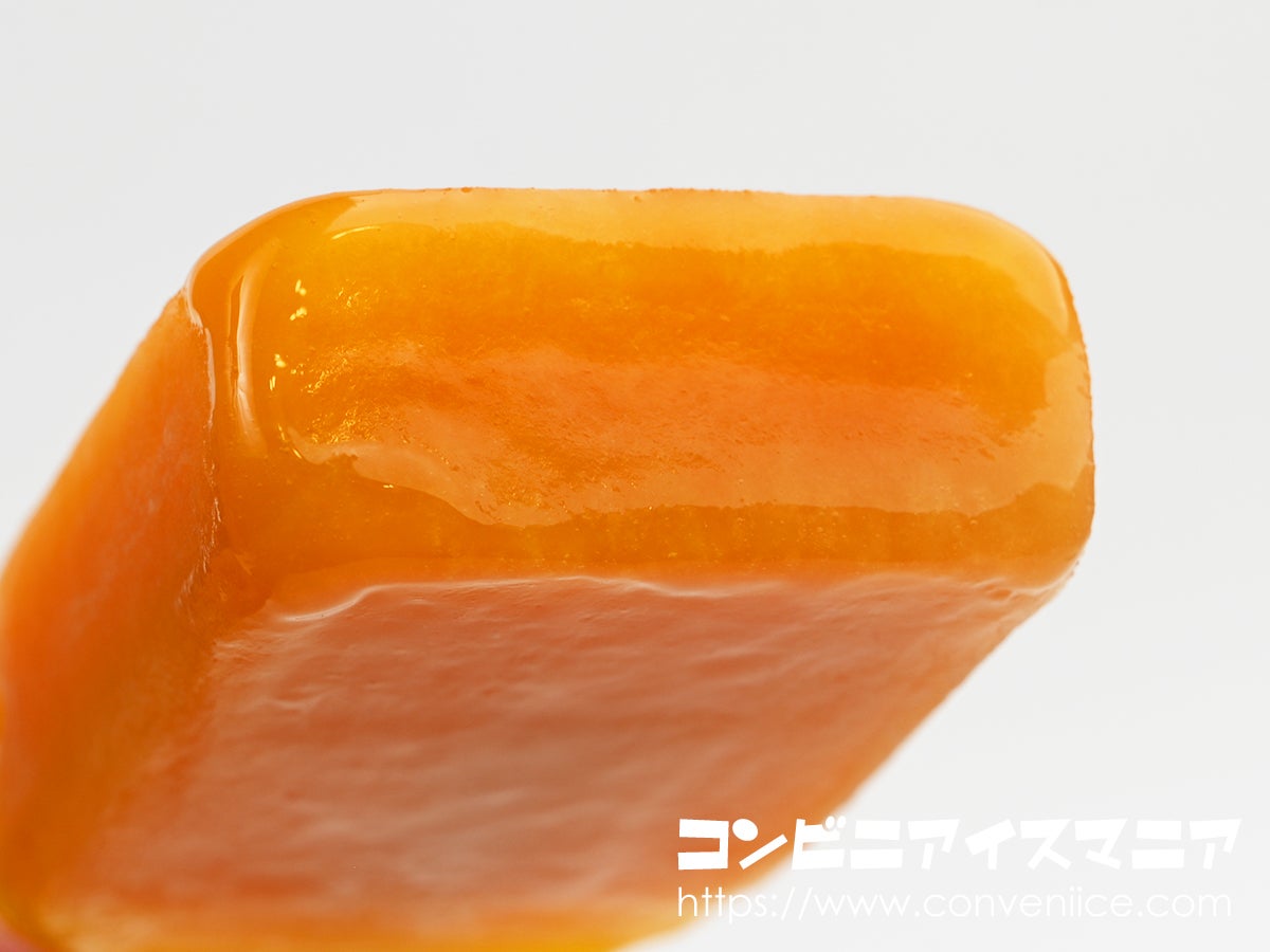 断面は、外側のやや淡いオレンジ色の層と、内側のより濃いオレンジ色の層の2層構造。まるでシリーズの特徴である「外側さっぱり、内側濃厚」の設計がここにも生きています。果肉感のあるつぶつぶとした粒子も見え、見るからにジューシー。