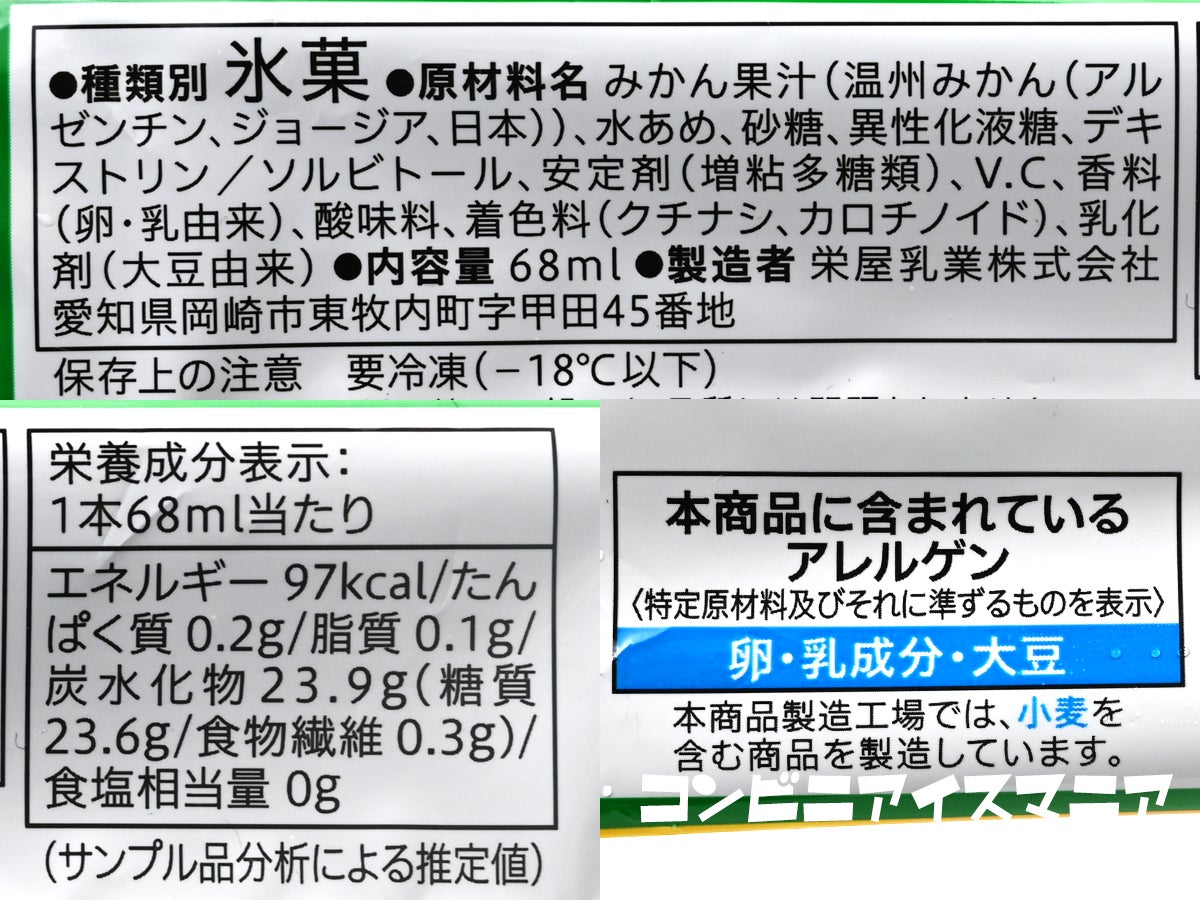 原材料を見ると、筆頭に「みかん果汁(温州みかん(アルゼンチン、ジョージア、日本))」と記載。複数産地の温州みかん果汁をブレンドしています。赤城乳業の『ガツン、とみかん』がみかん果肉のゴロゴロ感で攻めるのに対し、こちらは果汁の濃厚さとねっとり食感で勝負。同じみかんアイスでも個性が異なります。