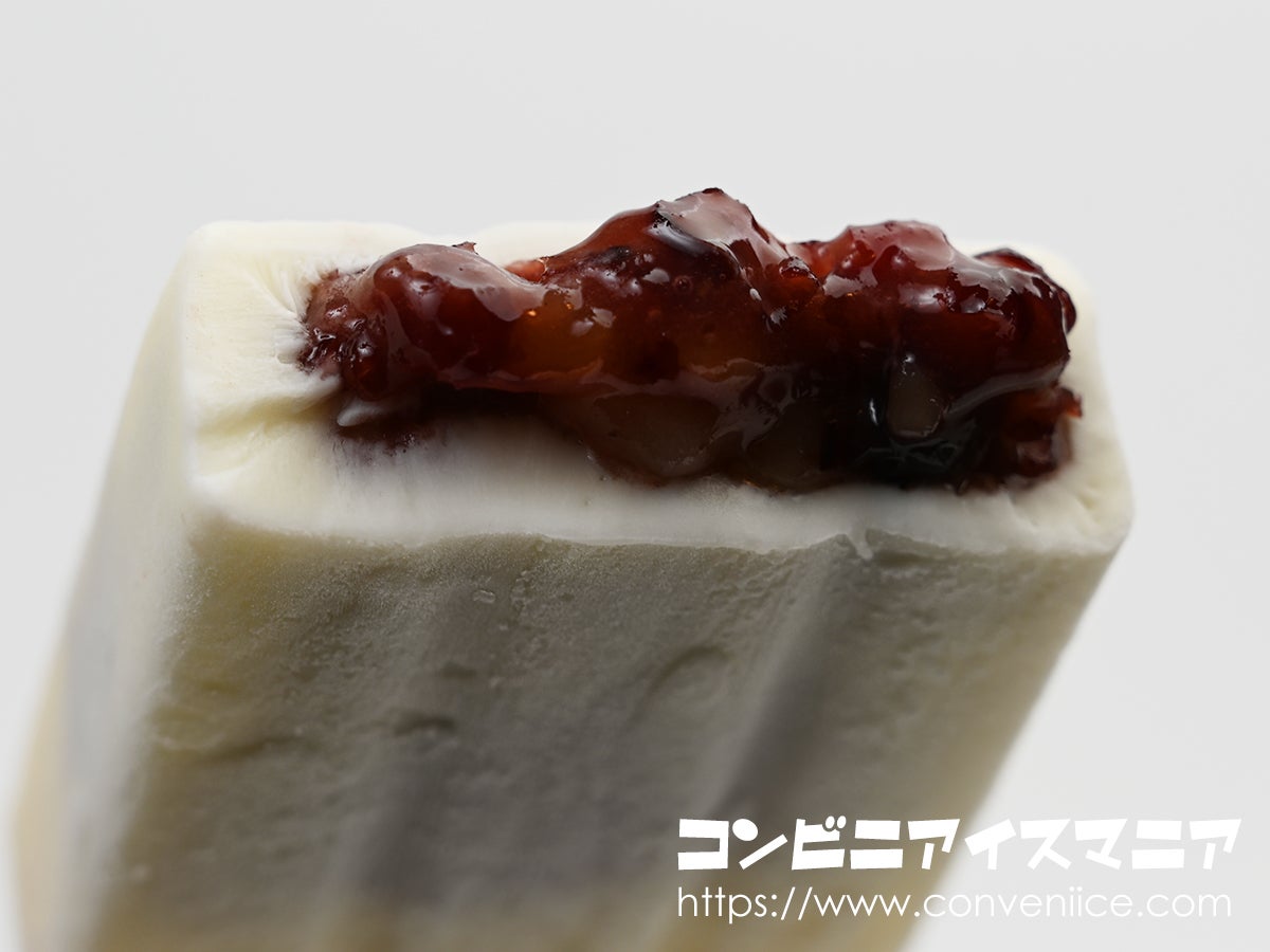 断面を見ると、ミルクアイスの中央部にどっしりとしたつぶあんが。あずきの粒がしっかり確認でき、さらにその中に半透明のつぶもちが顔を覗かせています。つぶあんの濃い小豆色と白いミルクアイスのコントラストが美しい。もう少し進むと、つぶあんの層がさらに広がり、小豆の粒感がはっきり。もちも存在感があり、3つの素材がぎゅっと詰まっている様子がよくわかります。なかなかの具沢山。井村屋 もち入りあずきミルク