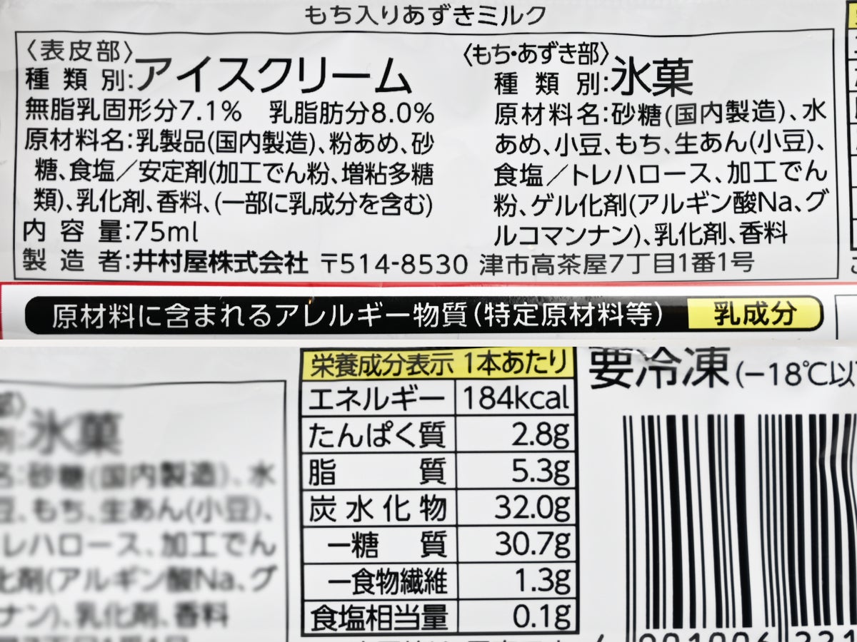 種類別は、表皮部が「アイスクリーム」(無脂乳固形分7.1%、乳脂肪分8.0%)、もち・あずき部が「氷菓」という2種構成。表皮部がアイスクリーム規格というのがポイントで、これは「あずきバー ミルク」(アイスミルク規格)よりもワンランク上。乳脂肪分8.0%ならではのコクとリッチなミルク感が楽しめます。