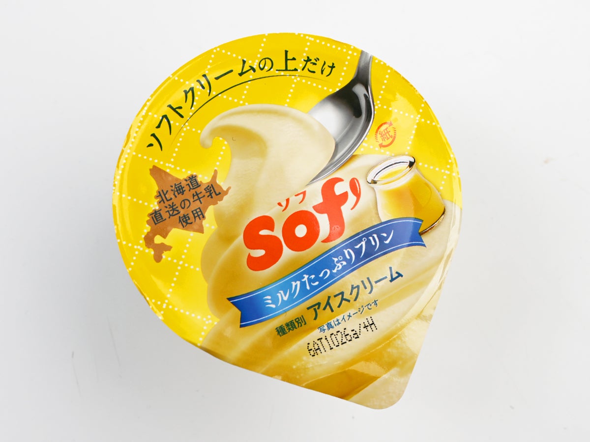 パッケージは鮮やかな黄色を基調としたプリンカラーのデザイン。蓋には「ソフトクリームの上だけ」のキャッチコピーが入り、左上には「北海道直送の牛乳使用」の文字と北海道のシルエット。中央にはおなじみのSof’ロゴと青いリボンで「ミルクたっぷりプリン」の文字。種類別はこだわりの「アイスクリーム」グレードです。