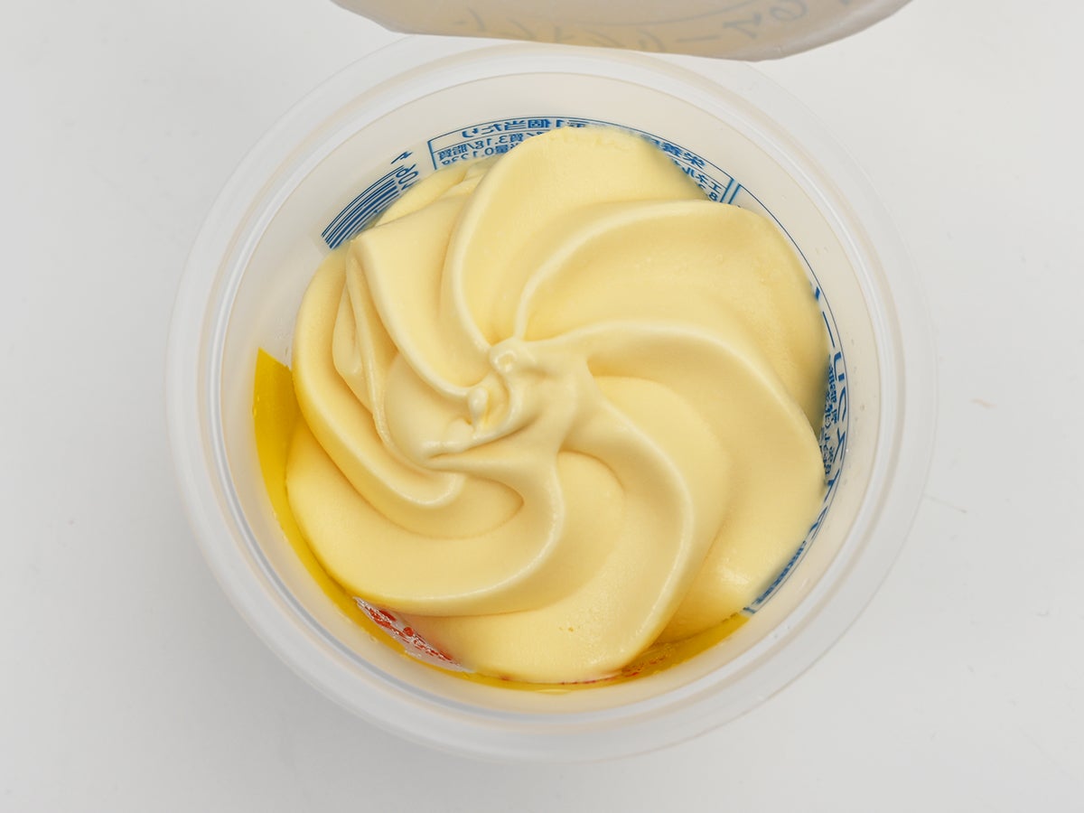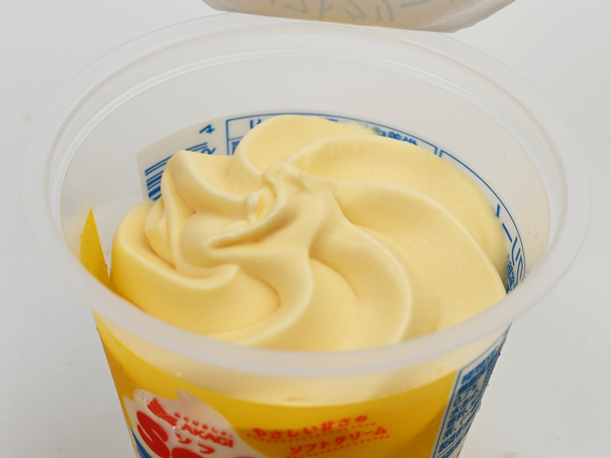 紙製の蓋をはがすと…おお、これはきれい。クリーム色に近い淡いイエローのアイスが、ソフトクリームらしい渦巻き模様を描いています。中央にはソフトクリームの先端部分を思わせる小さな突起。この細かなディテールが「ソフトクリームの上だけ」というコンセプトを体現しています。