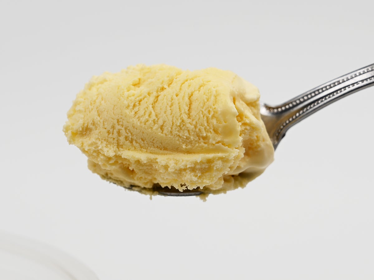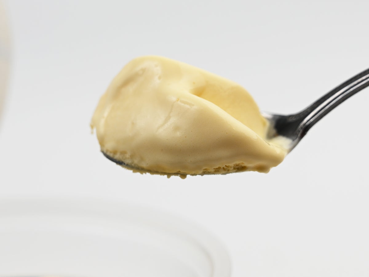 表面はなめらかで、見ているだけで柔らかさが伝わってくる質感。通常の北海道ミルクバニラが純白なのに対して、こちらはしっかりプリンらしい卵色。カロチノイド色素による着色ですが、卵と牛乳の自然なイメージにうまくマッチ。