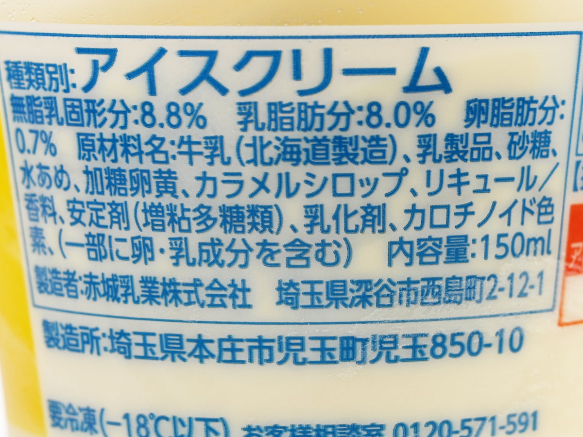 注目すべきは、原材料に「加糖卵黄」と「カラメルシロップ」が入っている点。カラメルソースが別で入っているわけではなく、卵と砂糖を焦がしたカラメルを生地に練り込むことでプリンらしい風味を表現しています。芸が細かい! カラメルソースをドバッと入れることもできたはずですが、あえてそうしない。ソフのコンセプトである”ソフトクリームの上だけ”という世界観を崩さず、シンプルにプリンの味わいを表現しているのが赤城乳業のこだわりを感じます。