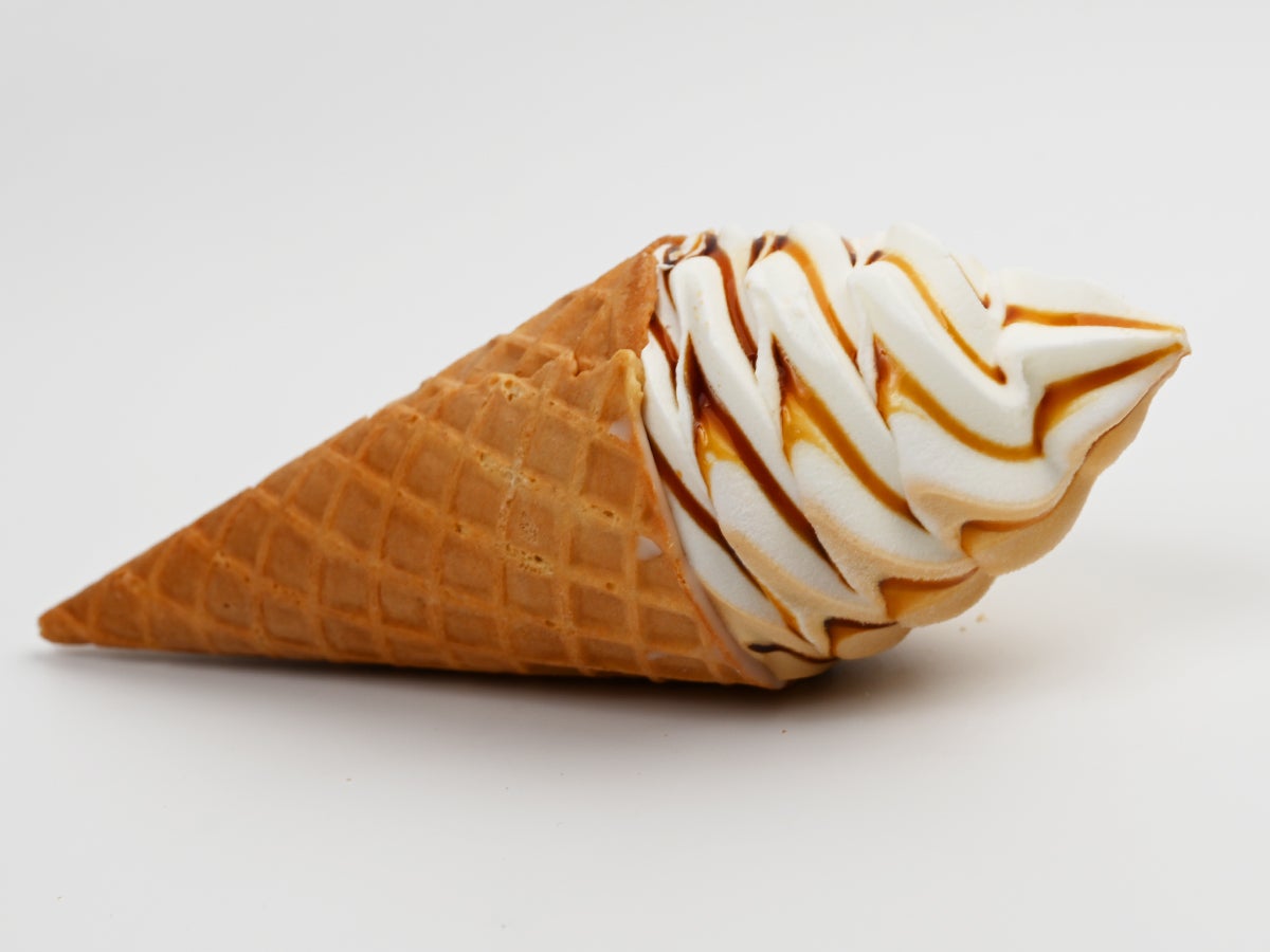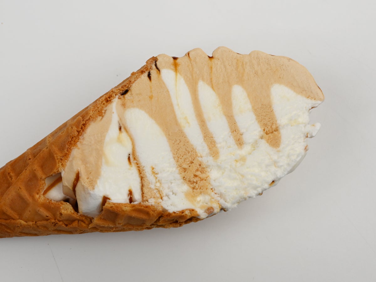 そして、このシリーズの真骨頂であるワッフルコーン。カリカリ食感の香ばしいシュガーコーンは健在で、内側にはホワイトコーチングが施されています。きなこの香ばしさとワッフルコーンの香ばしさがマッチしていて、和のテイストとコーンの菓子感が見事に融合。冷凍庫から出して少し時間を置くと、黒蜜ソースがとろりとなめらかになり、アイス全体がよりなじんでおいしさが増しますよ。