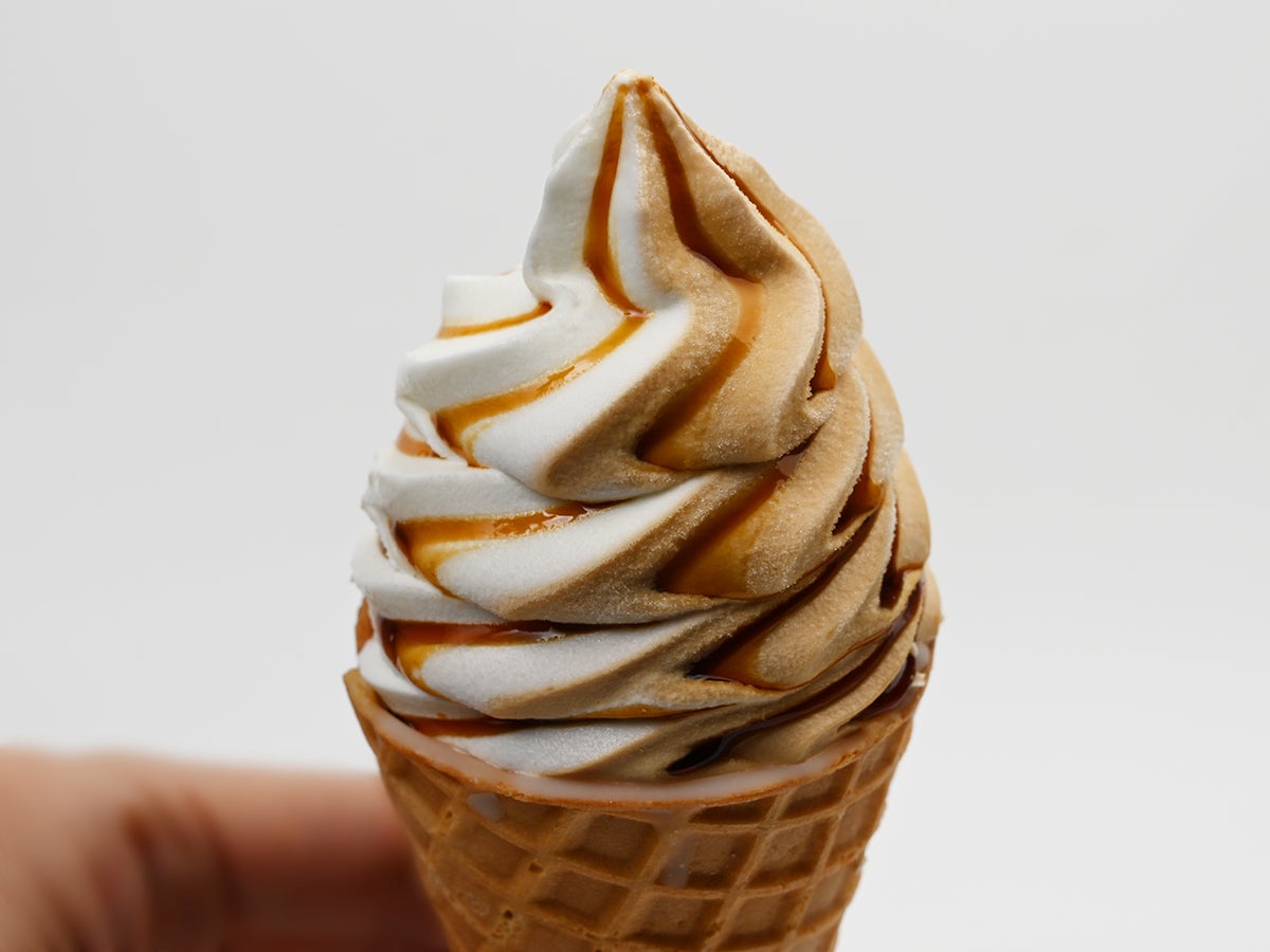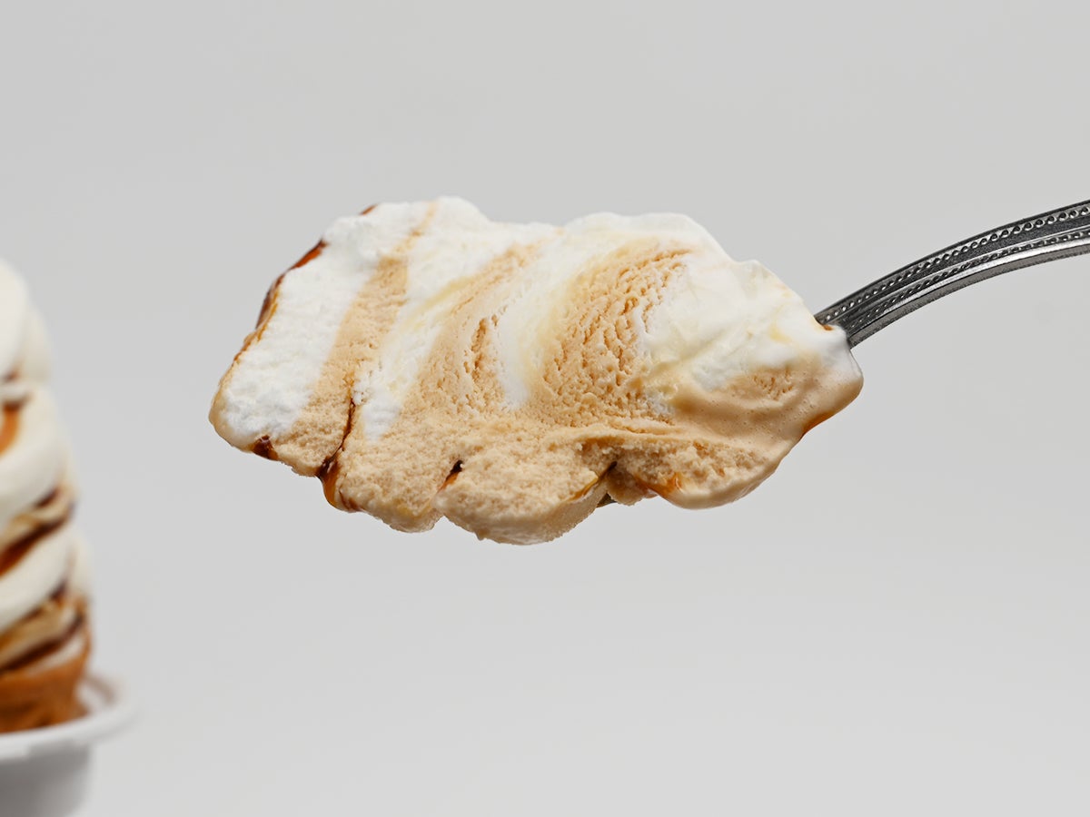 透明の蓋を取り外すと、きなこアイスとミルクアイスのマーブル模様が美しいソフトクリーム型のアイスが登場。