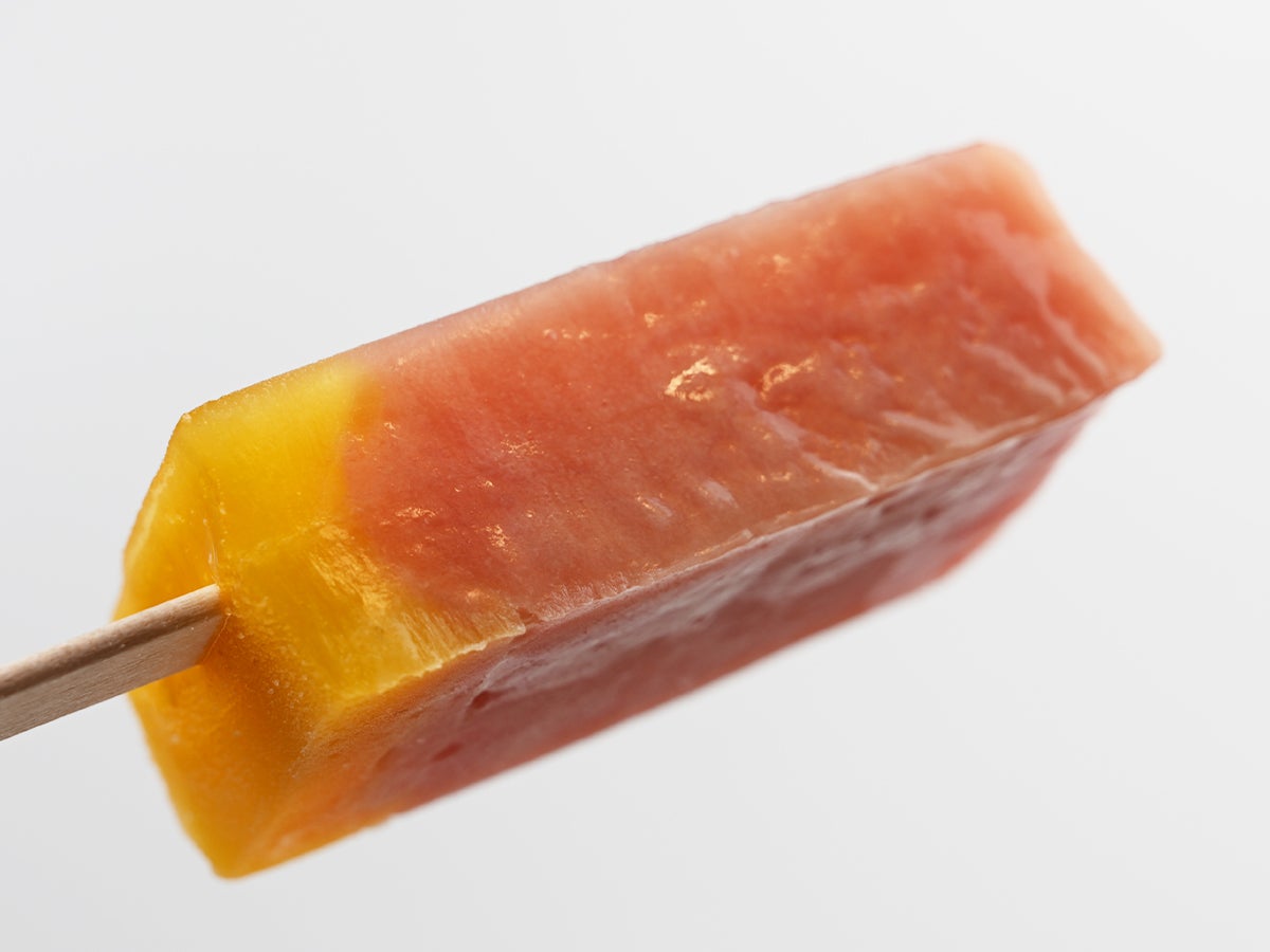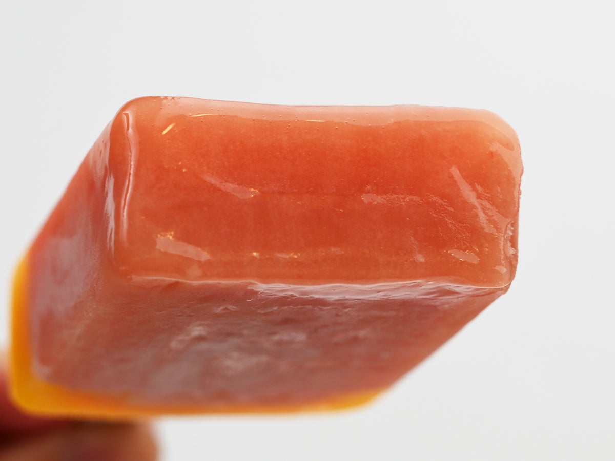 袋から取り出すと、見た目が美しい。上部(棒から遠い側)はくすんだオレンジがかったピンク色、下部(棒に近い側)は鮮やかな黄橙色と、濃淡のはっきりした2層仕立てになっています。