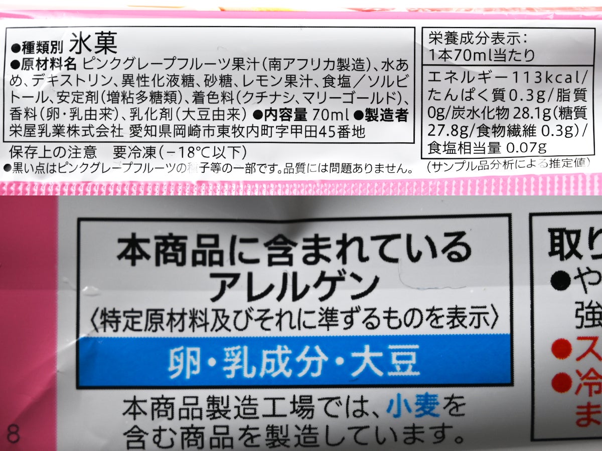 果汁は82%。前作は87%だったので珍しくダウンしています。シャリシャリとしたアイスの食感のなかに、グレープフルーツのジューシーさが凝縮されていて、まるで本物の果実をかじったときの「ジュワ」っと広がる感覚に近い。ただ、ストレートに酸っぱいわけではなく、柑橘が苦手な人でもなんとか食べられるくらいには調整されています。