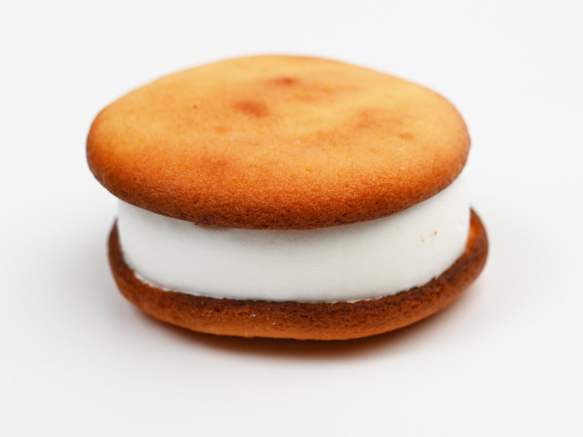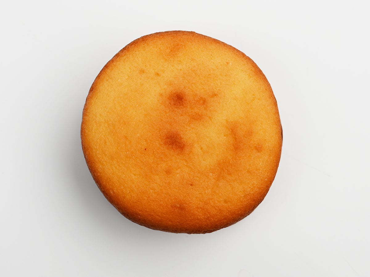 袋から取り出すと、ころんとまんまるのフォルム。上下をきつね色のケーキ生地で挟んで、間に白いアイスがサンドされています。スポンジケーキをイメージしたという生地は、表面にところどころ焼き色がついていて、本物のケーキっぽい雰囲気。上から見ると、均一なきつね色で中央にやや濃い焼き色が入っています。