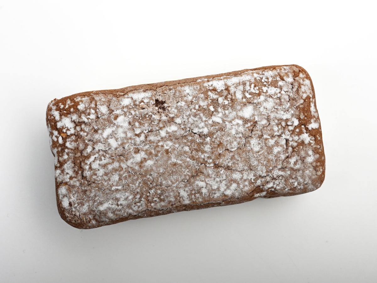 袋から取り出すと、長方形のケーキサンドアイスが登場。ブッセや焼き菓子のダックワーズを思わせる見た目です。表面にはびっしりと白い粉糖がかかっていて、ティラミスのココアパウダーを想起させます。内容量は84ml。手に取ると意外と厚みがあって、ボリューム感は十分。