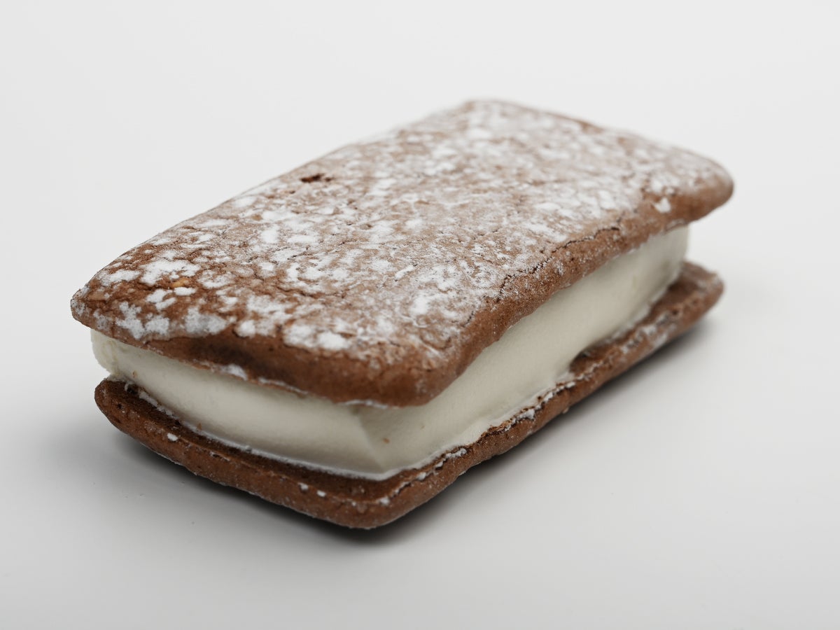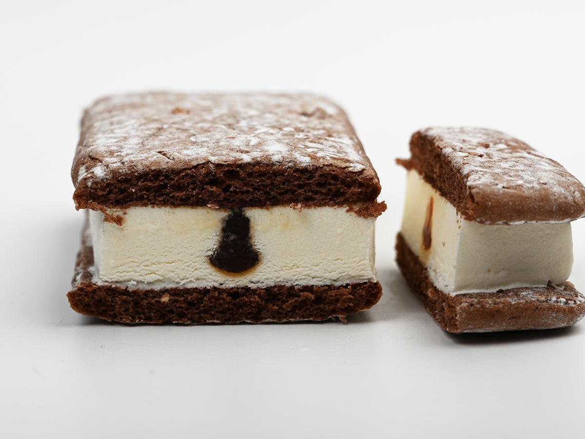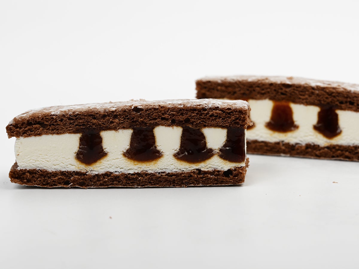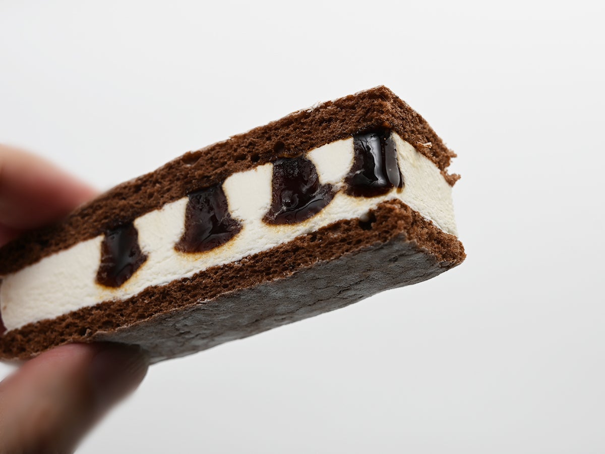 ココアケーキ生地は冷凍状態でもふわっとやわらかく、ほんのりとした甘さとココアの香ばしさがあります。かたすぎず、やわらかすぎず、サンドアイスの生地として絶妙なバランス。