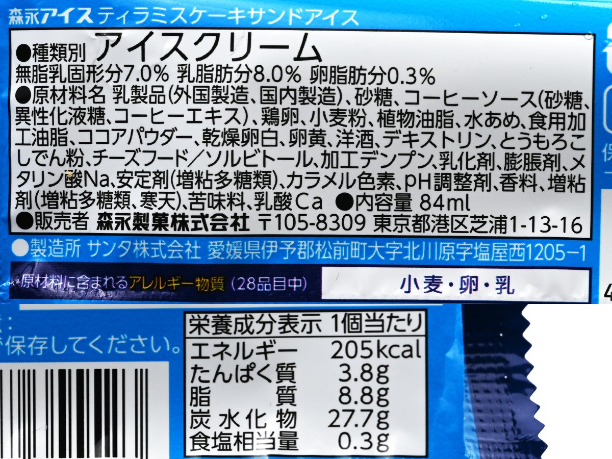 パッケージは前回同様、ダークブルーを基調としたデザイン。左上に森永製菓のおなじみのエンゼルマーク。中央に「ティラミスケーキ サンドアイス」の文字。右側にはケーキサンドの断面写真が配置されており、ココアケーキとアイス、コーヒーソースの3層構造がわかりやすく見えます。全体として落ち着いた大人の雰囲気で、コンビニの棚の中でも上品な存在感を放っていました。左端にはティラミスの盛り付けイメージも描かれていて、イタリアの国旗カラーのワンポイントもオシャレ。