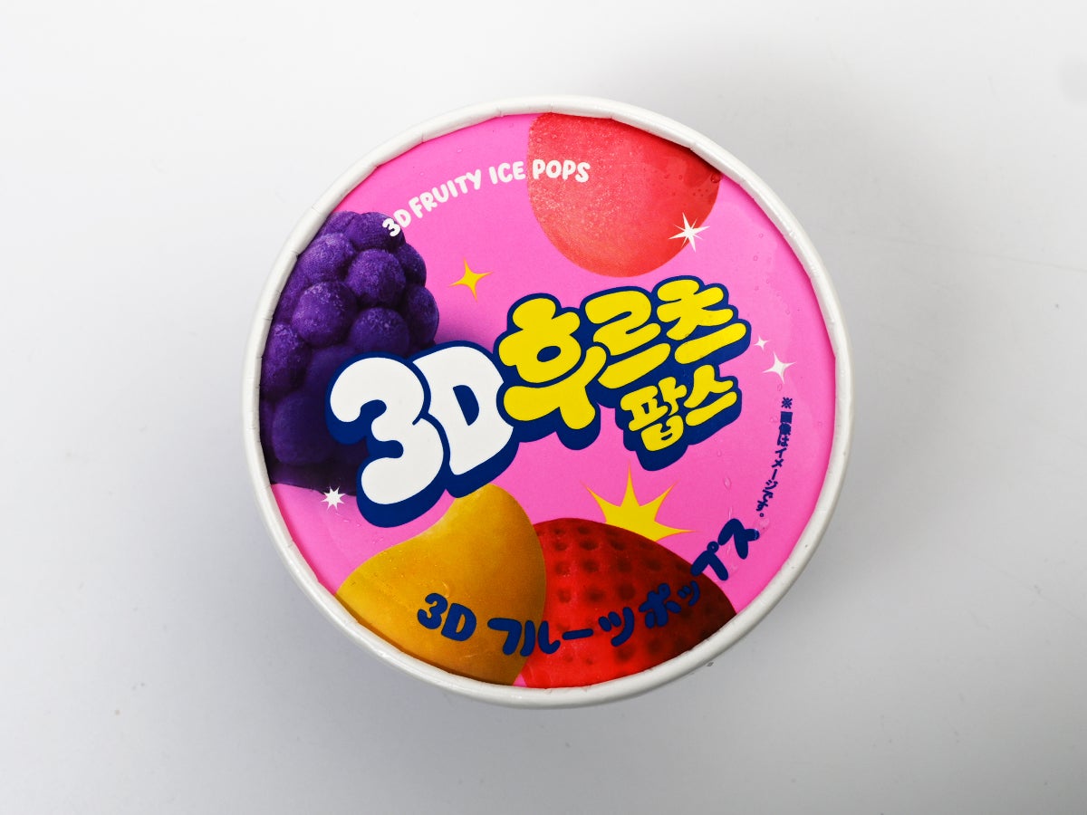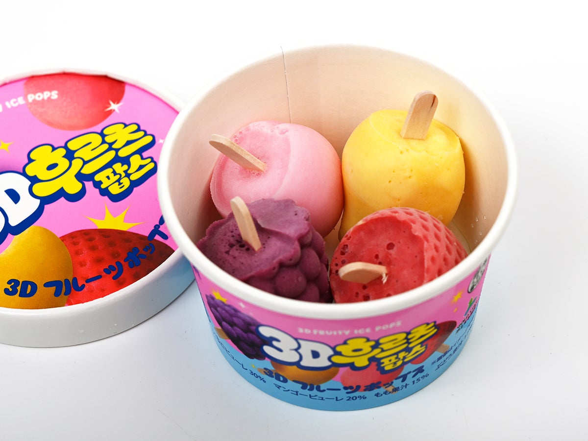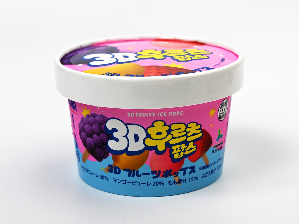パッケージはかなりポップ。ピンクを基調にしたフタ面には、いちご、ぶどう、マンゴー、ももの4種のアイスがドーンとレイアウトされていて、3D후르츠 팝스(3Dフルーツポップス)のハングル表記が目を引きます。下半分はブルーに切り替わり、4本の棒付きアイスが並んだイラストが描かれています。