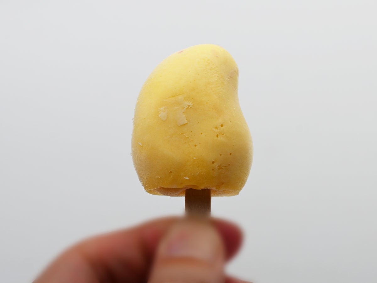 マンゴーからいきましょう。かじると、シャリッとした氷菓の食感のあとにマンゴーピューレ20%のねっとりした甘みがじわっと広がります。