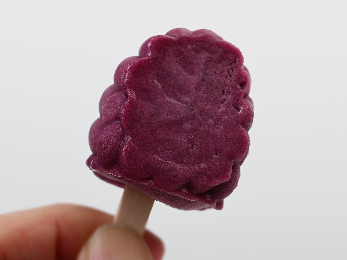 1個あたり26mlなので、手のひらにちょこんと乗るサイズ感。前作の3Dフルーツアイスが1本90mlだったことを考えると、約3分の1以下のミニチュアサイズです。それぞれに木製スティックが刺さっていて、指でつまんでパクッと食べられます。