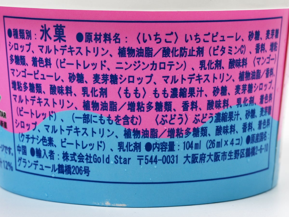 原材料はフレーバーごとに分けて記載されていて、いちごはいちごピューレを筆頭に砂糖、麦芽糖シロップ、マルトデキストリン、植物油脂など。着色にはビートレッドやニンジンカロテンが使われています。マンゴーはマンゴーピューレが主原料。ももはもも濃縮果汁、ぶどうはぶどう濃縮果汁がベースで、着色にクチナシ色素やビートレッドを使用。いずれもフルーツ原料を先頭に据えた構成。